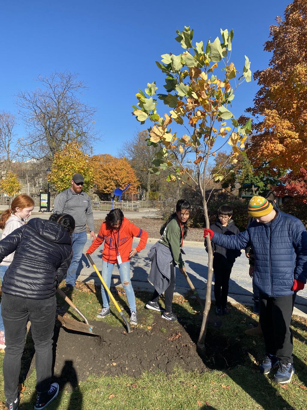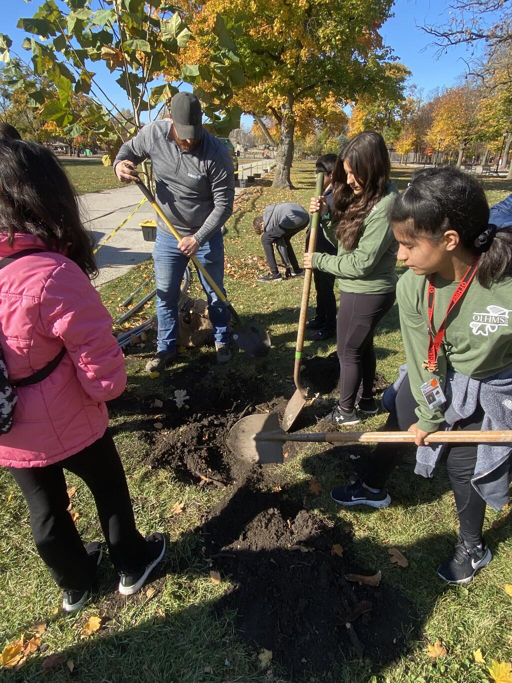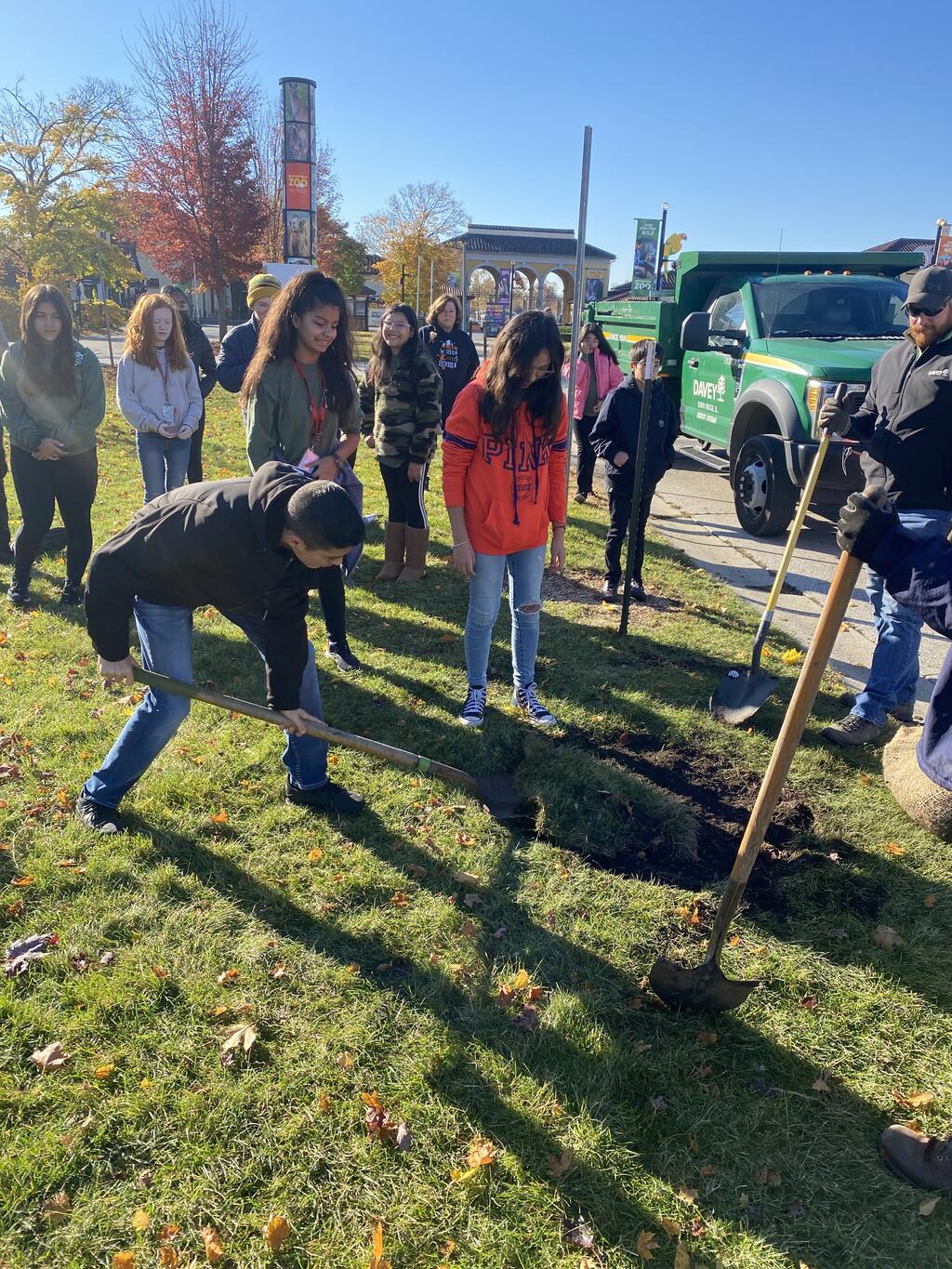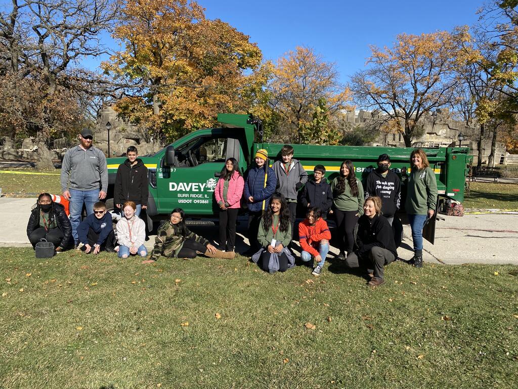 This fall, a partnership was formed between the school's Forestry and Gardening Club, Davey Tree Service, the Brookfield Zoo, and Mr. Bob Uzudanis to transplant mature trees from the school's nursery to the zoo. The Brookfield Zoo is currently working on a reforestation project to restore the loss of trees from a recent storm. Through this process, students had the opportunity to learn about the importance of tree conservation and the role that trees play in our environment.