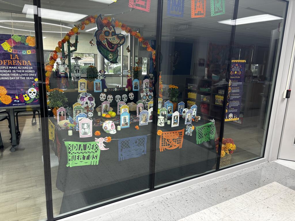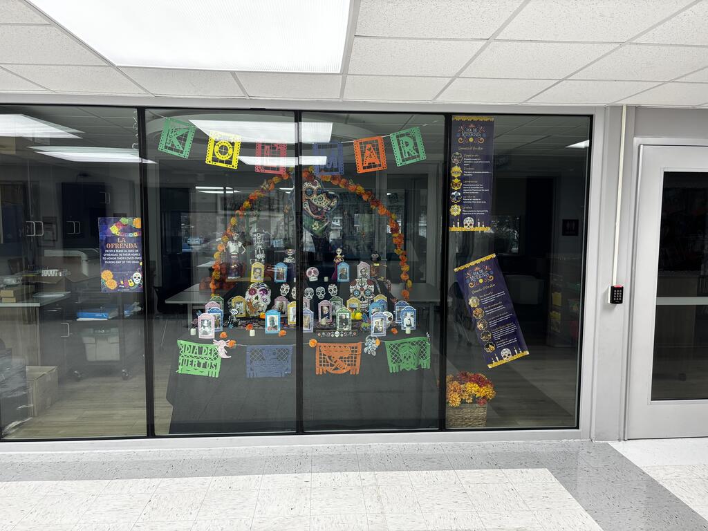 The ofrenda is on display in the library, right at the front of the main hallway, so everyone can stop by to admire and appreciate this meaningful celebration of life.