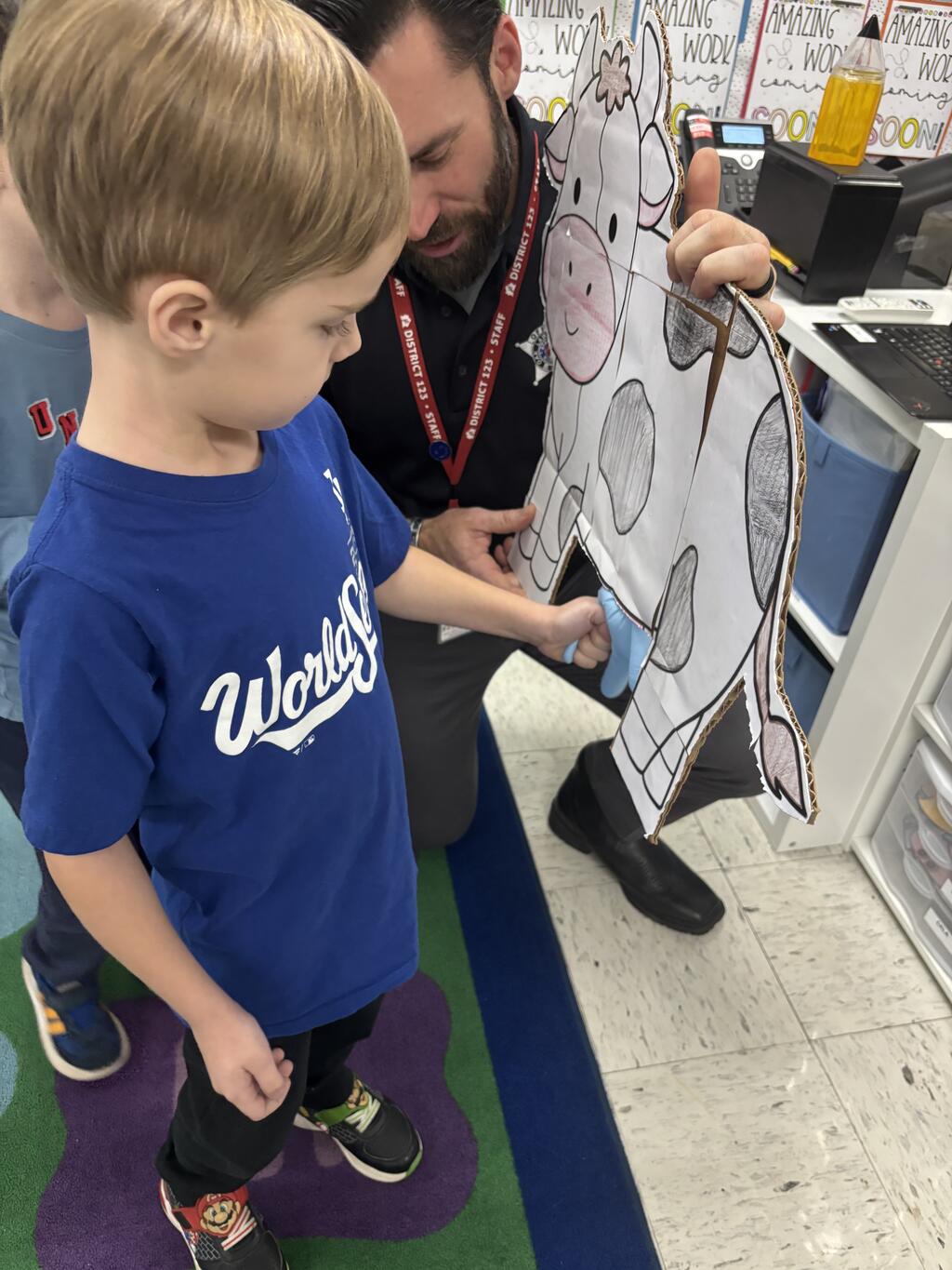 Officer Zelhart showed pictures of the actual animals from his farm, which made it feel like the class took a mini field trip without leaving school. Then came everyone’s favorite part… the model cow! The kindergarteners got to try “milking the cow,” and they had the BEST time. Officer Zelhart even told them they were already pros!