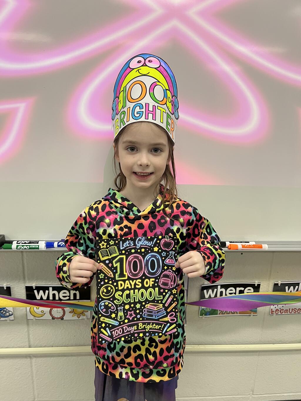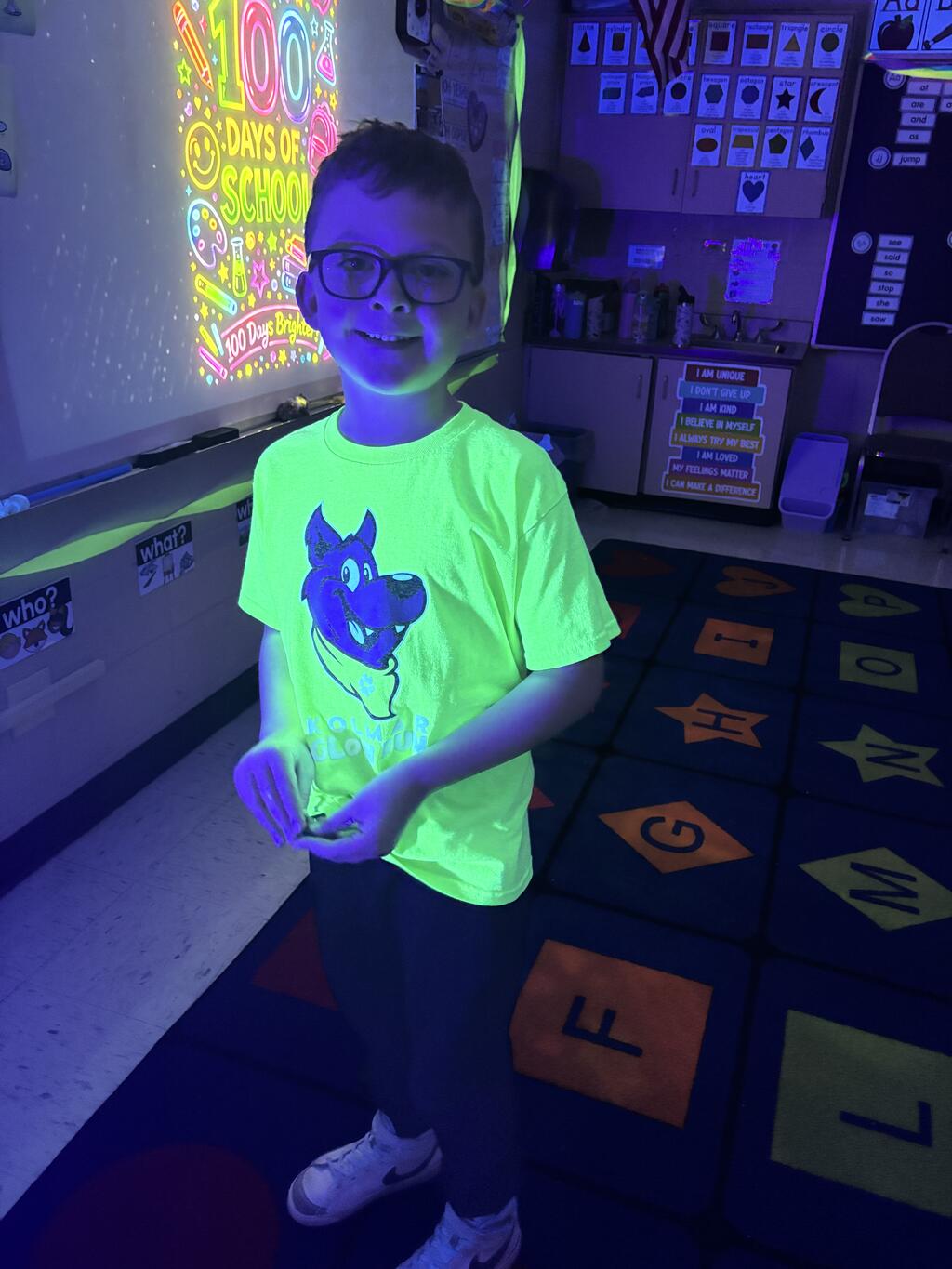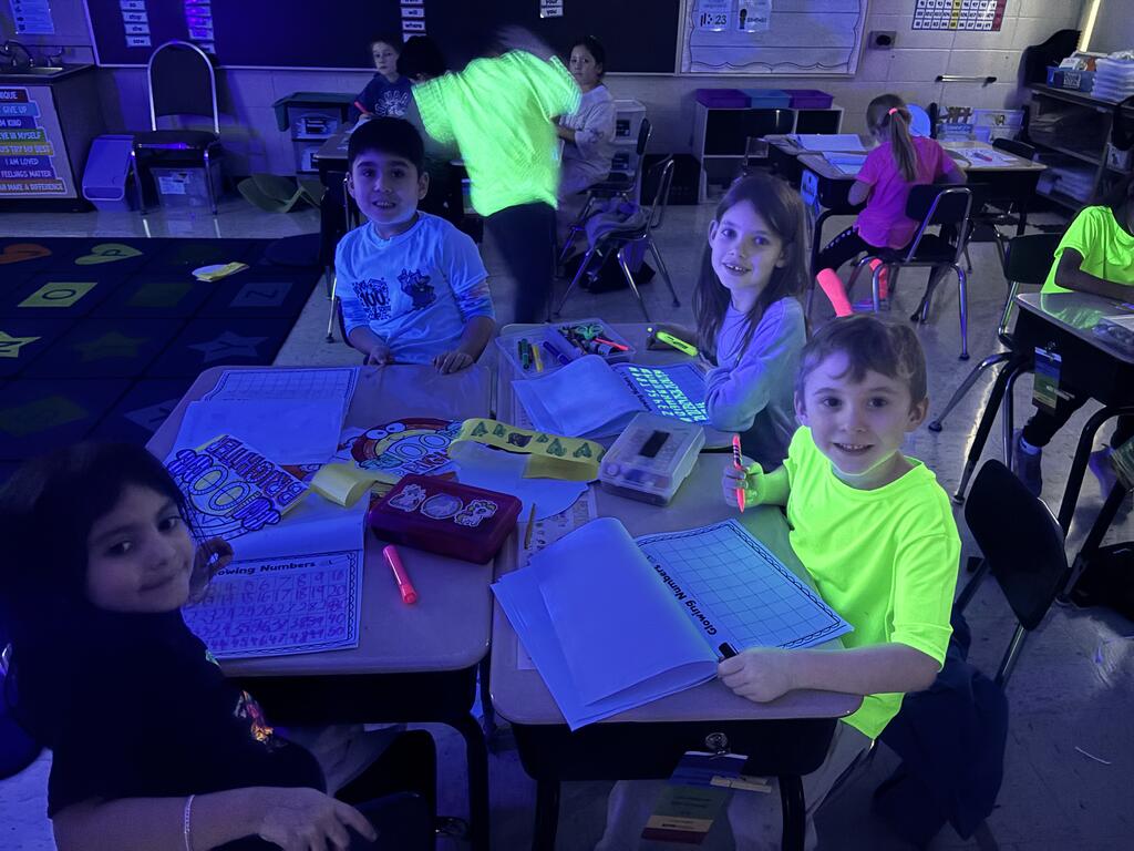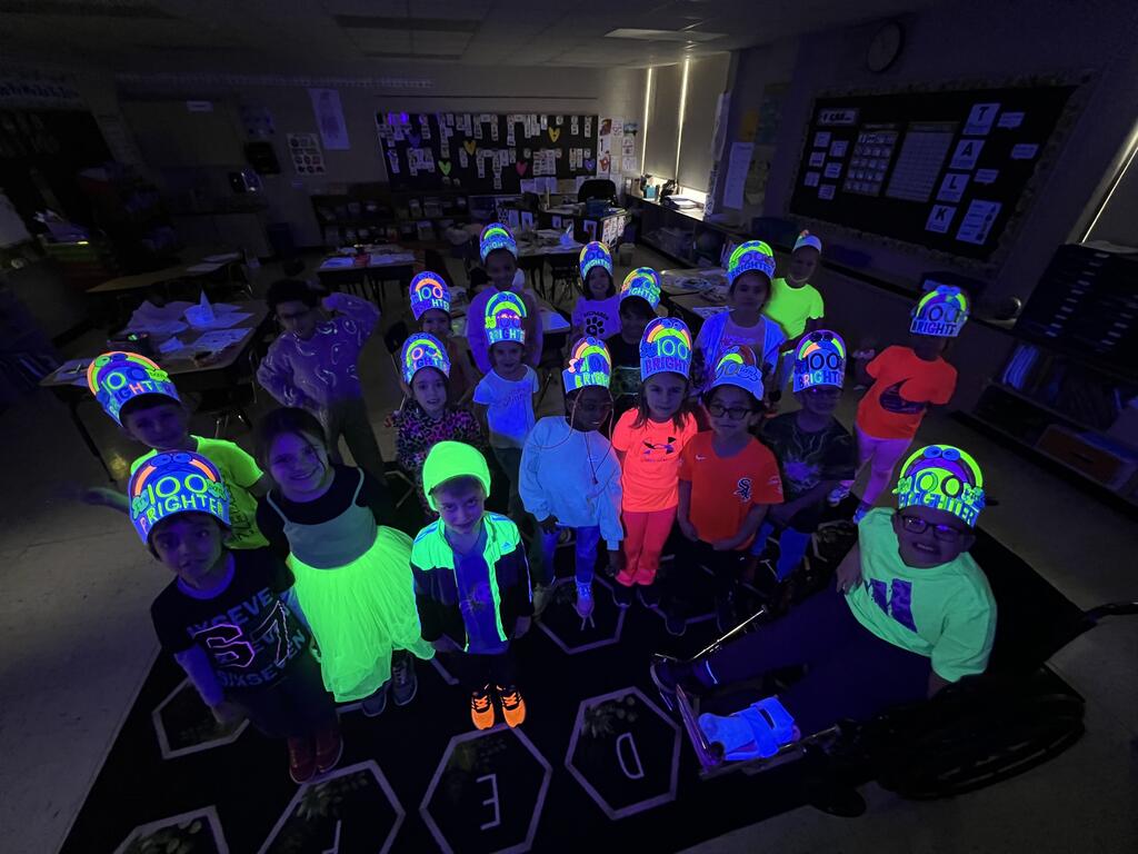 First-graders celebrated by being 100 Days Brighter! Dressed in neon and glowing under blacklights, they lit up their classrooms — literally. Students danced during glow-in-the-dark brain breaks, practiced writing their numbers to 100 with glowing tools, and teamed up with their fifth grade buddies to create special 100th Day crafts. The smiles said it all.