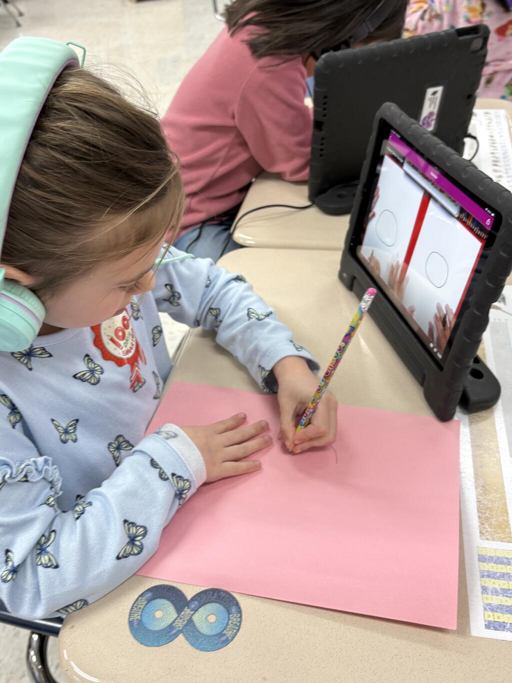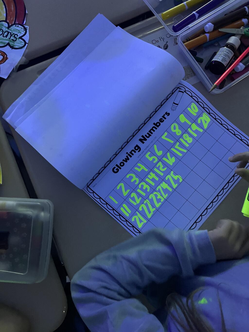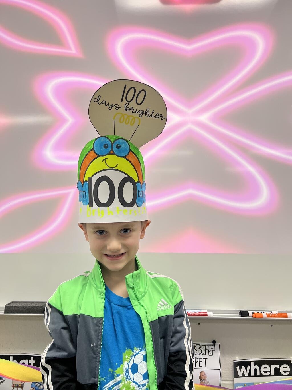 First-graders celebrated by being 100 Days Brighter! Dressed in neon and glowing under blacklights, they lit up their classrooms — literally. Students danced during glow-in-the-dark brain breaks, practiced writing their numbers to 100 with glowing tools, and teamed up with their fifth grade buddies to create special 100th Day crafts. The smiles said it all.