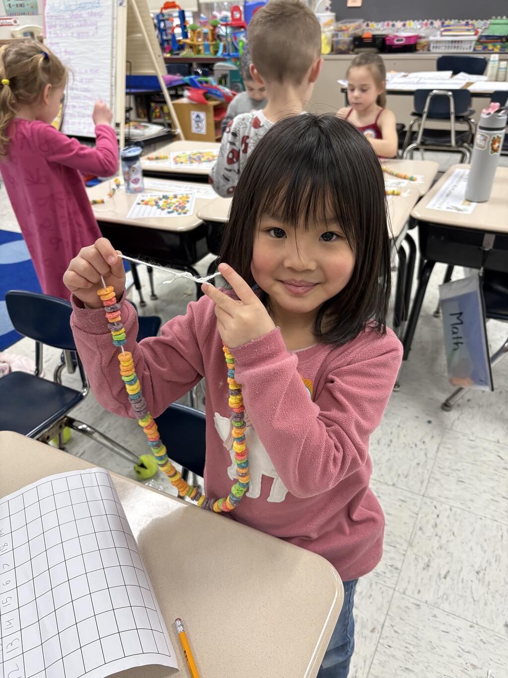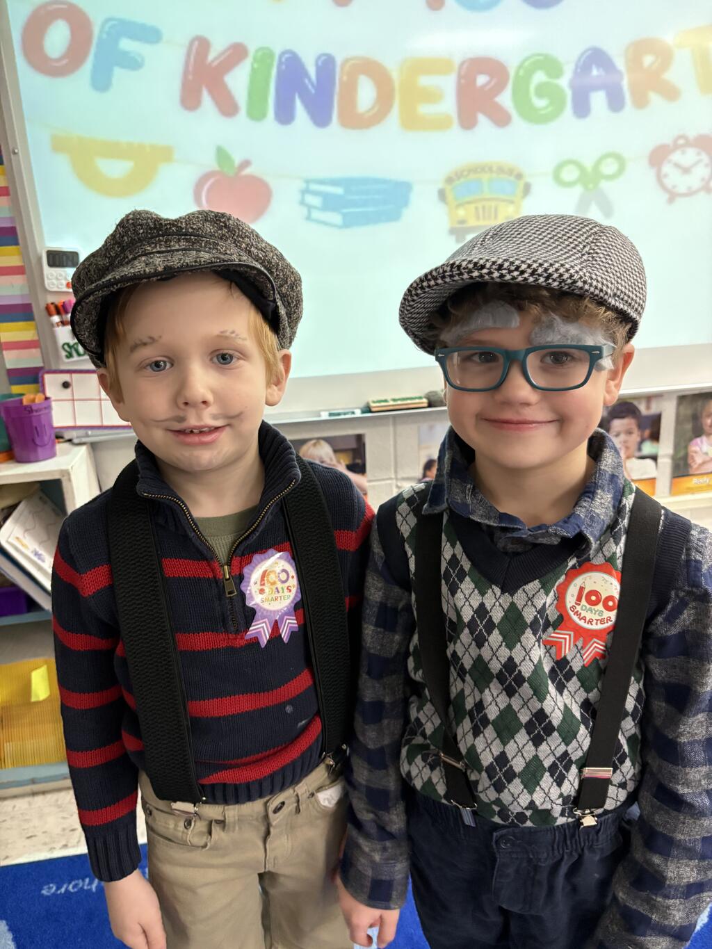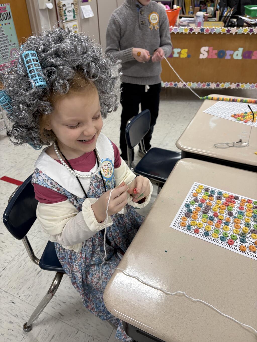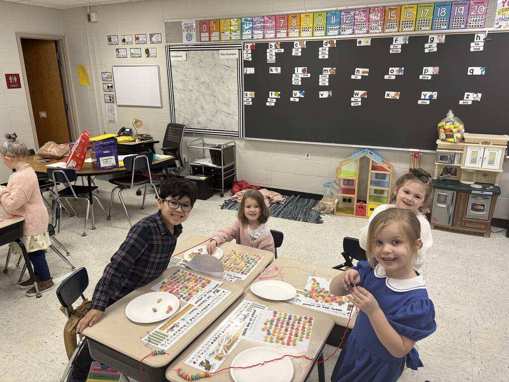 Kindergartners stole the show by dressing up as 100-year-olds with gray hair, glasses, and canes. With their “wise” new looks, they jumped right into their 100th Day activities. They built with 100 items, made colorful Froot Loop necklaces, counted all the way to 100, and wrote about what they would do if they were 100 years old. Their answers were thoughtful, silly, and sometimes surprisingly sweet.