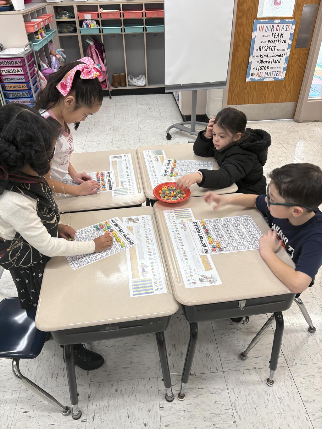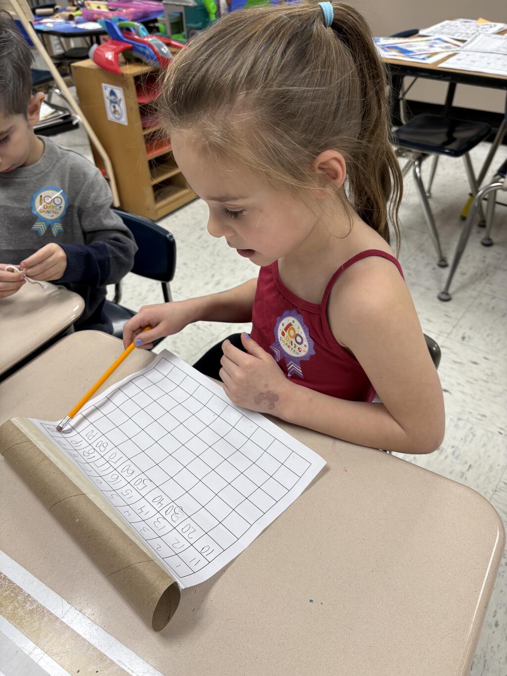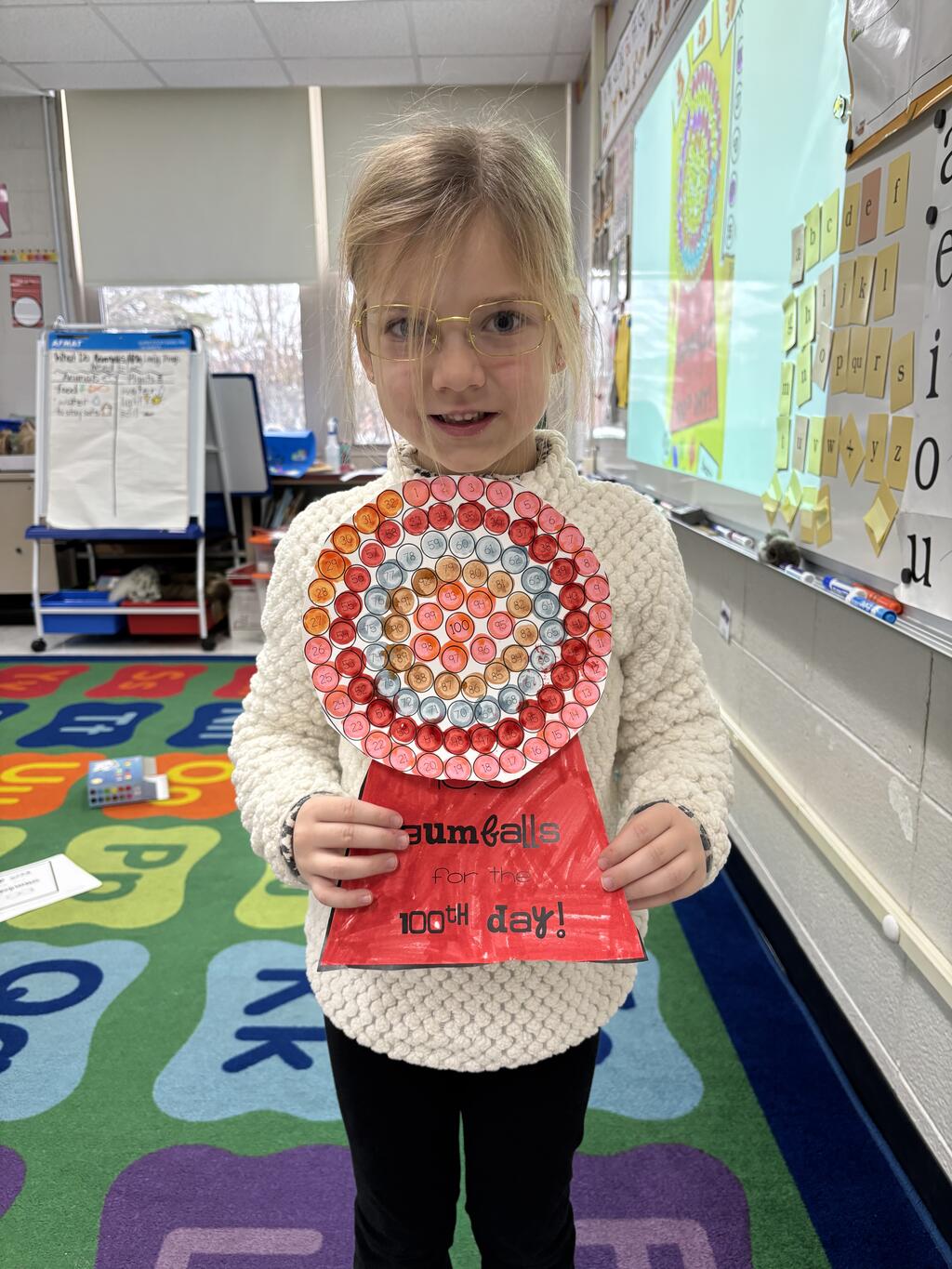 Kindergartners stole the show by dressing up as 100-year-olds with gray hair, glasses, and canes. With their “wise” new looks, they jumped right into their 100th Day activities. They built with 100 items, made colorful Froot Loop necklaces, counted all the way to 100, and wrote about what they would do if they were 100 years old. Their answers were thoughtful, silly, and sometimes surprisingly sweet.