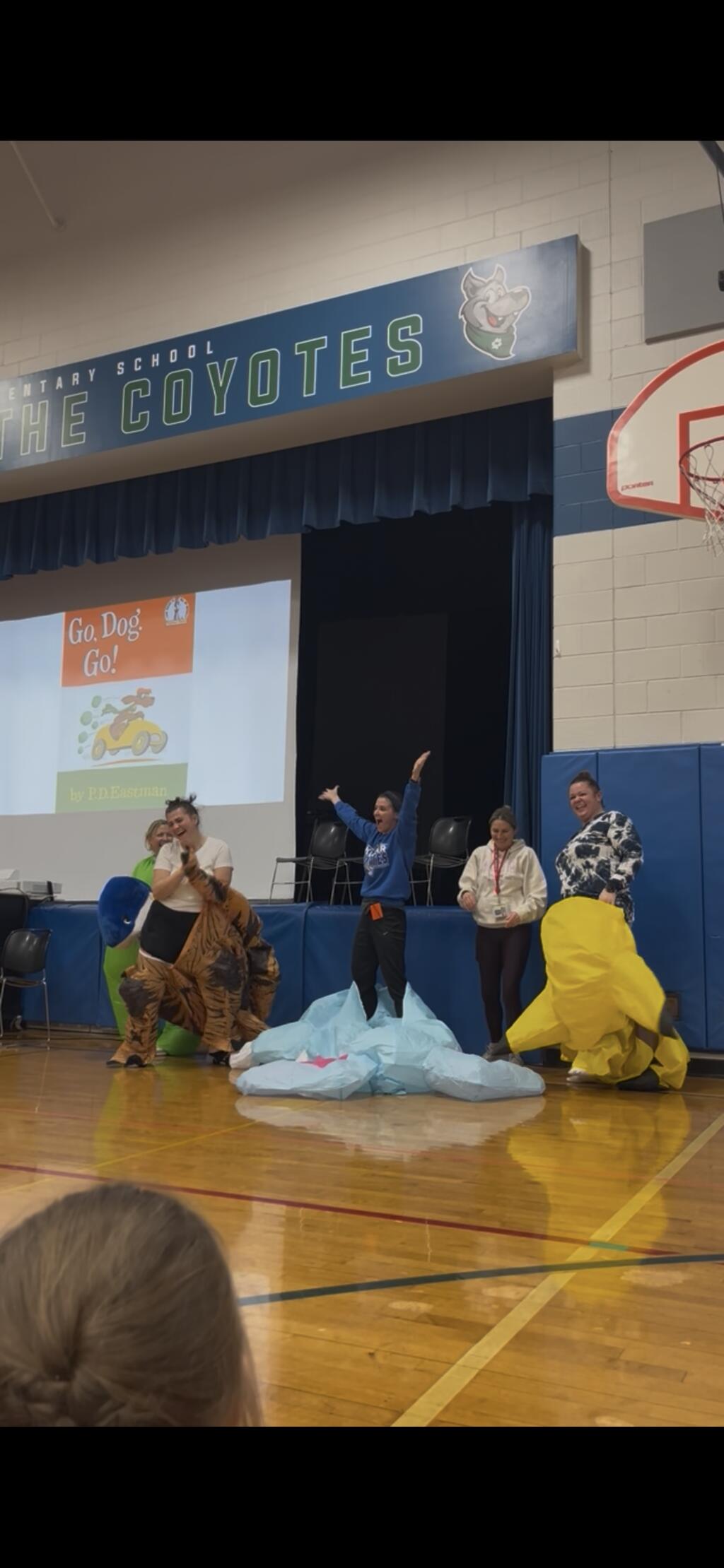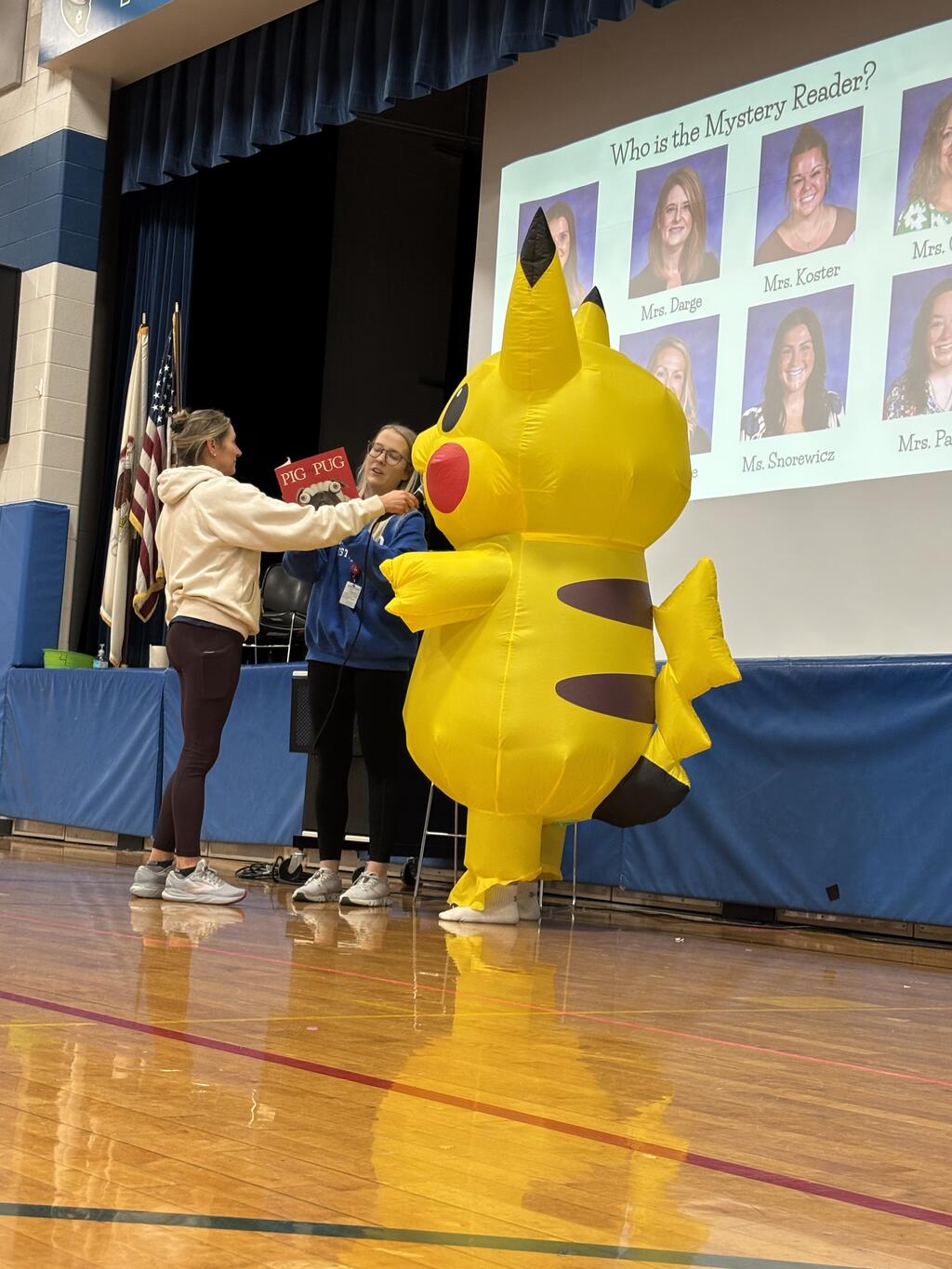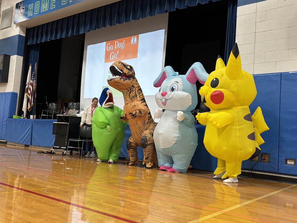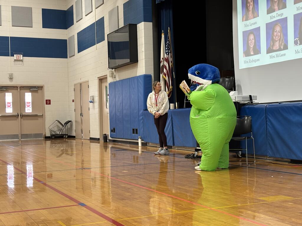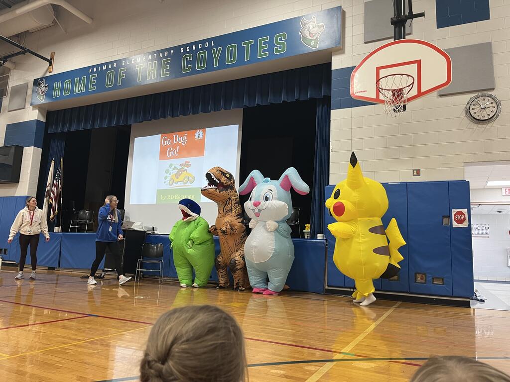 During the assembly, students listened carefully as mystery readers came out to read a story. The twist? The readers were actually Kolmar staff members dressed in silly costumes! Some wore giant inflatable outfits while others changed their voices to make it even harder for students to guess who they were.