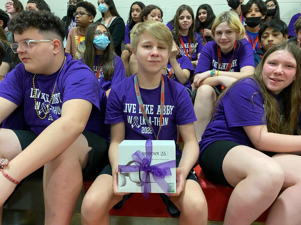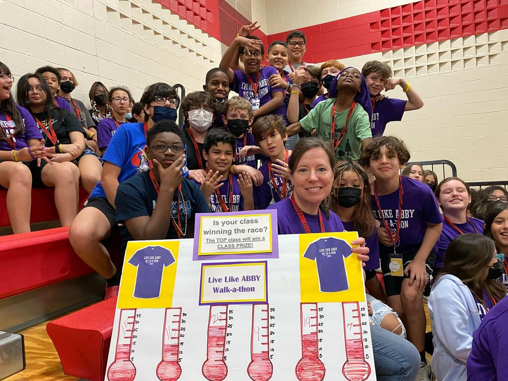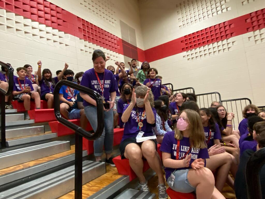Following the walk-a-thon was an all-school pep assembly where students won different raffles and gift cards for their participation. Abby’s parents and siblings joined in the fun as well as the Live Like Abby board members. 7th grader Anthony Orshonsky was the top fundraiser of the school with $700 in donations! The Advisories with the most participation in the walk-a-thon in each grade level were Mrs. Rayson’s 6th grade Advisory, Ms. Teichert’s 7th grade Advisory, and Mrs. Merkle’s 8th grade Advisory.