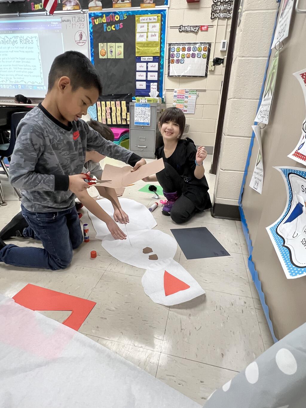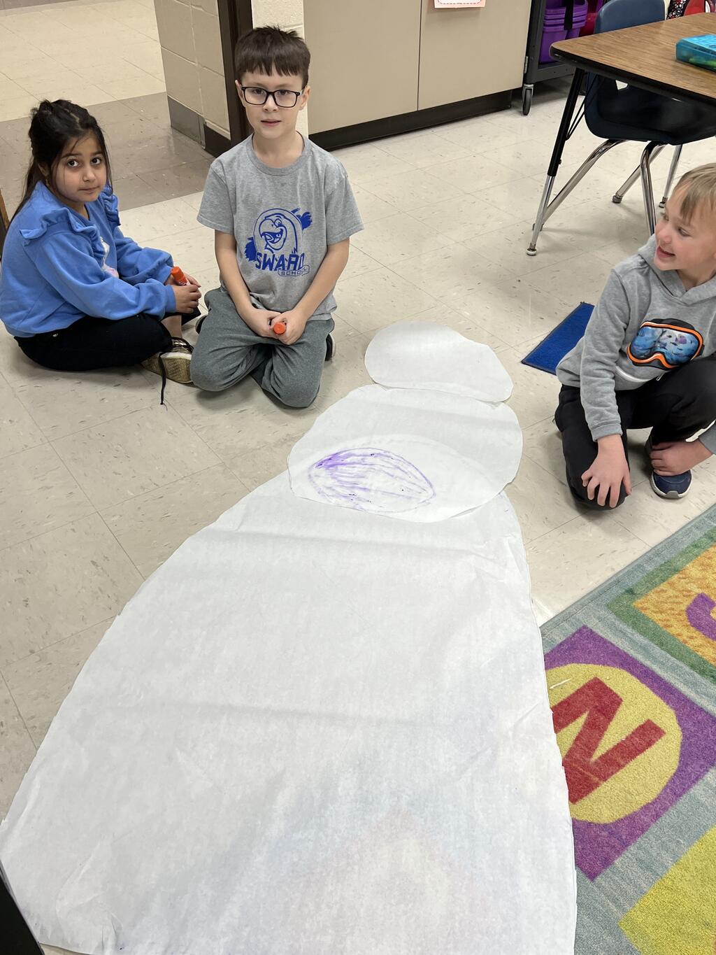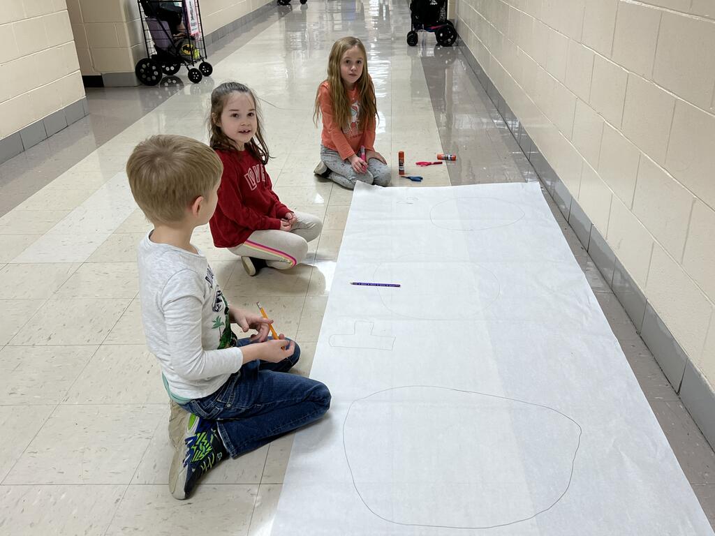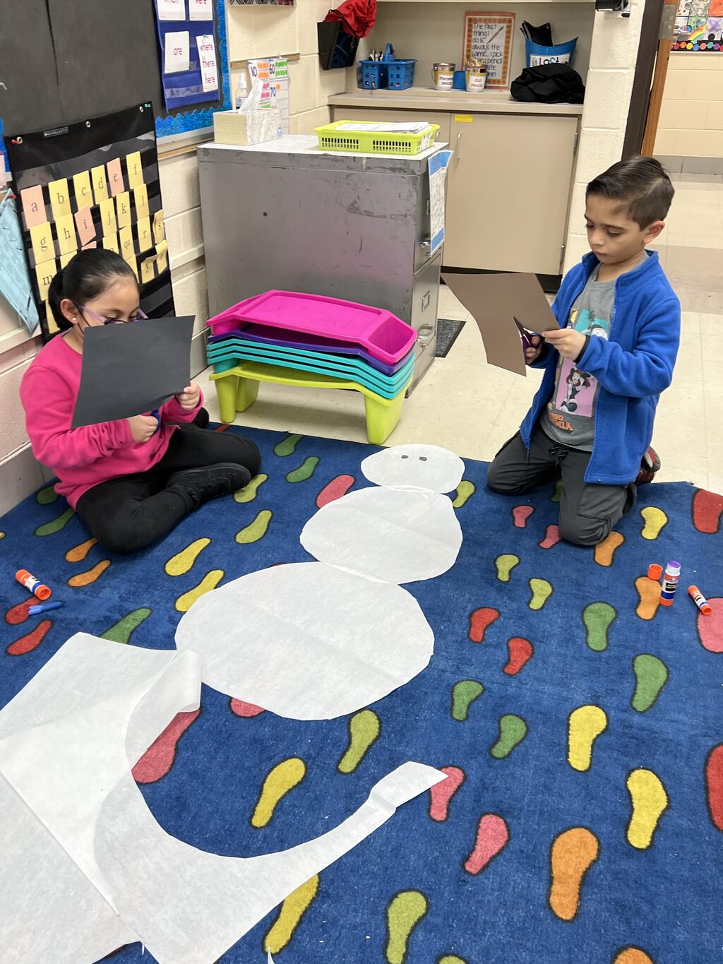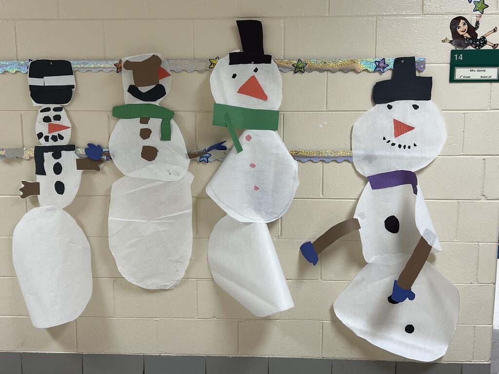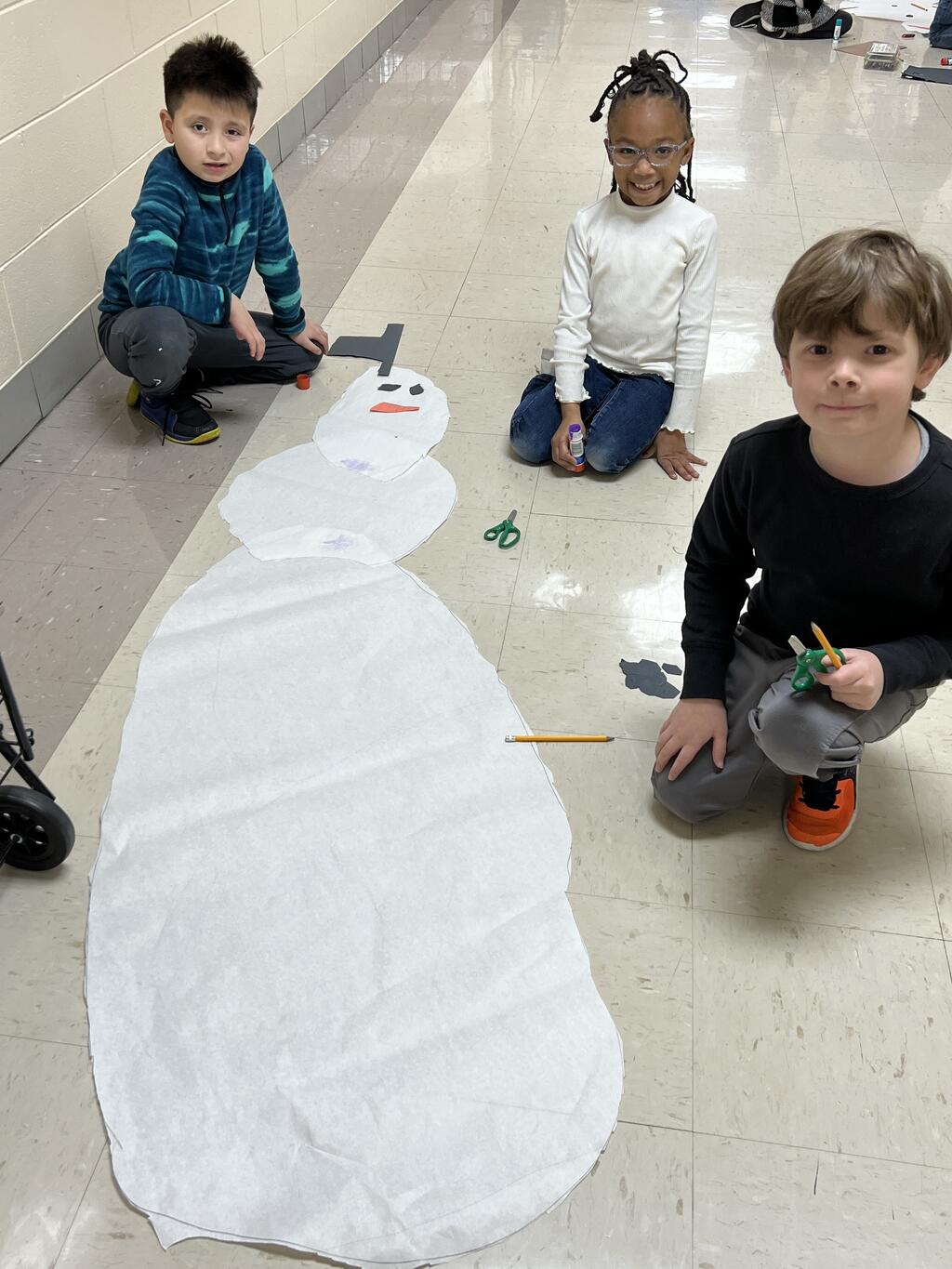 During the first week back after a long winter break, first graders participated in a STEM challenge to build the biggest snowman they could from one 6 foot sheet of white bulletin board paper. Teachers only provided a few simple rules for the STEM challenge: student would only get one 6 foot sheet of paper, the snowmen had to have three seperate paper circles and must include buttons, eyes, nose, arms etc. The objective was to build the biggest snowman they could and to be as creative as possible.