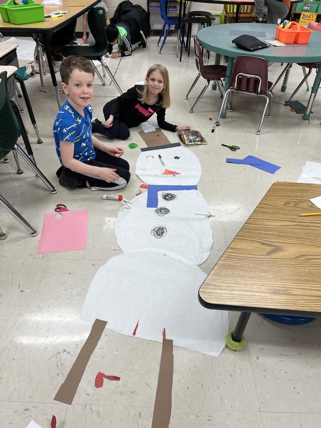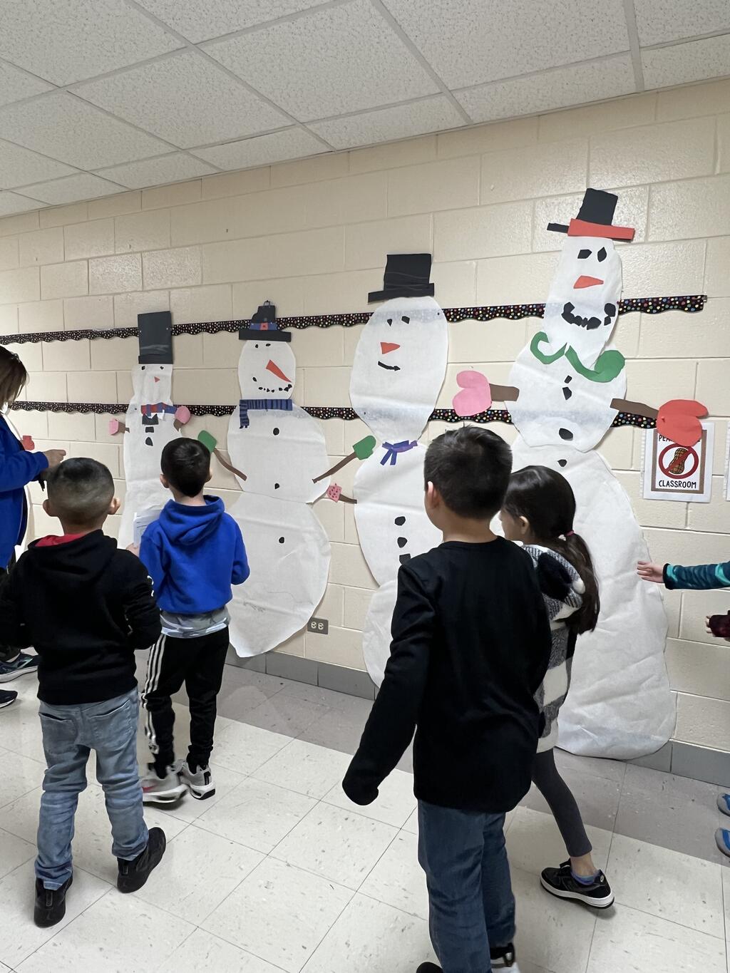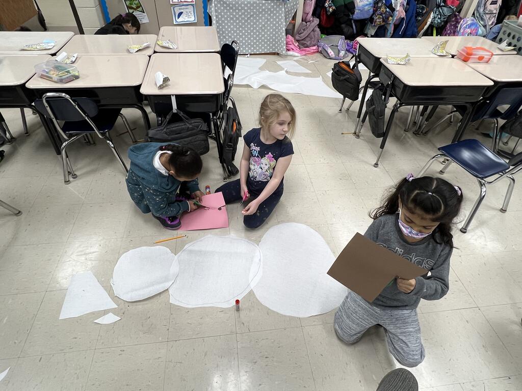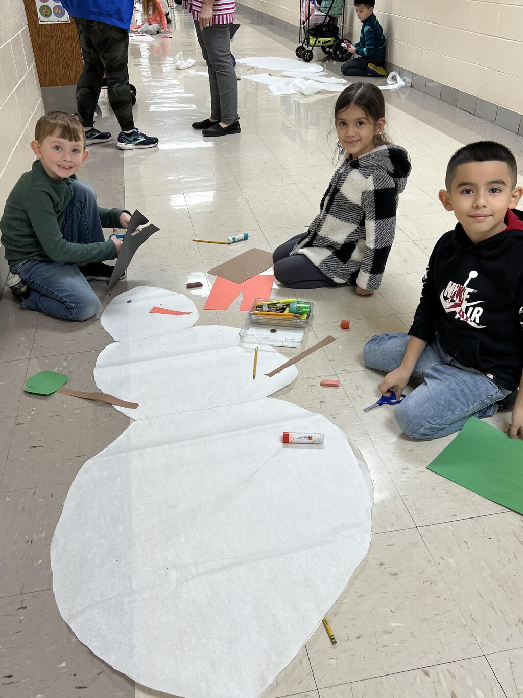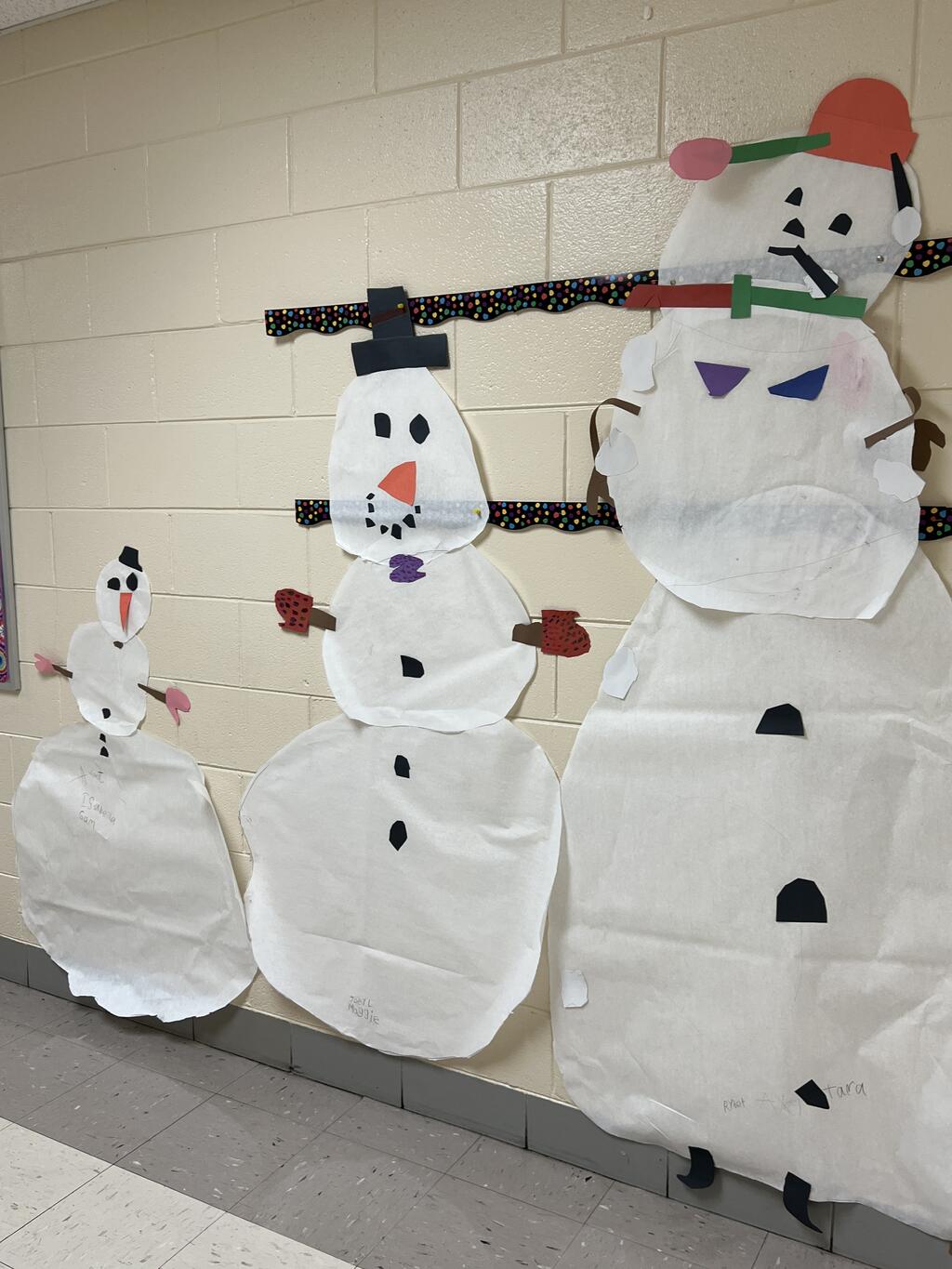 During the first week back after a long winter break, first graders participated in a STEM challenge to build the biggest snowman they could from one 6 foot sheet of white bulletin board paper. Teachers only provided a few simple rules for the STEM challenge: student would only get one 6 foot sheet of paper, the snowmen had to have three seperate paper circles and must include buttons, eyes, nose, arms etc. The objective was to build the biggest snowman they could and to be as creative as possible.