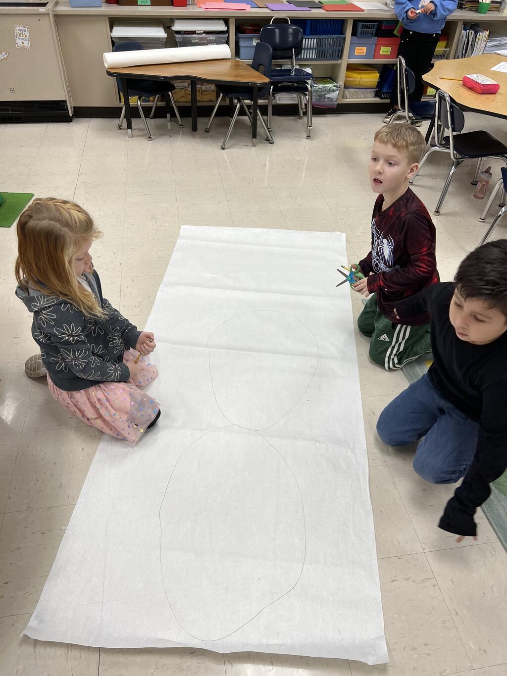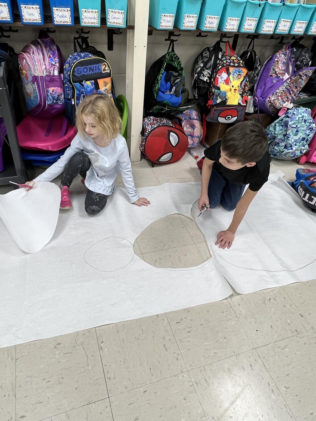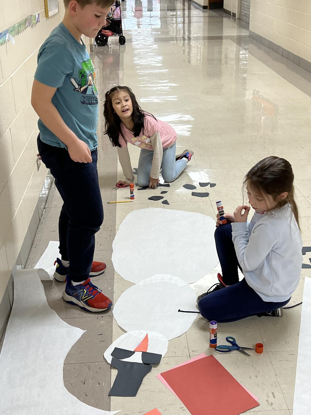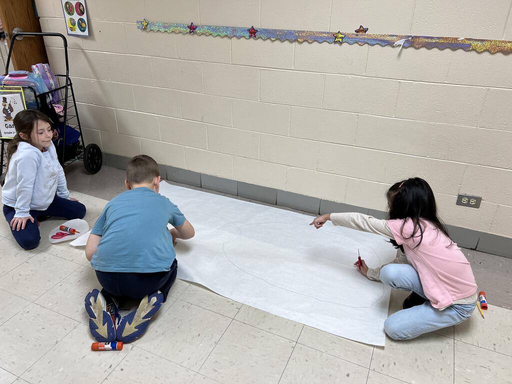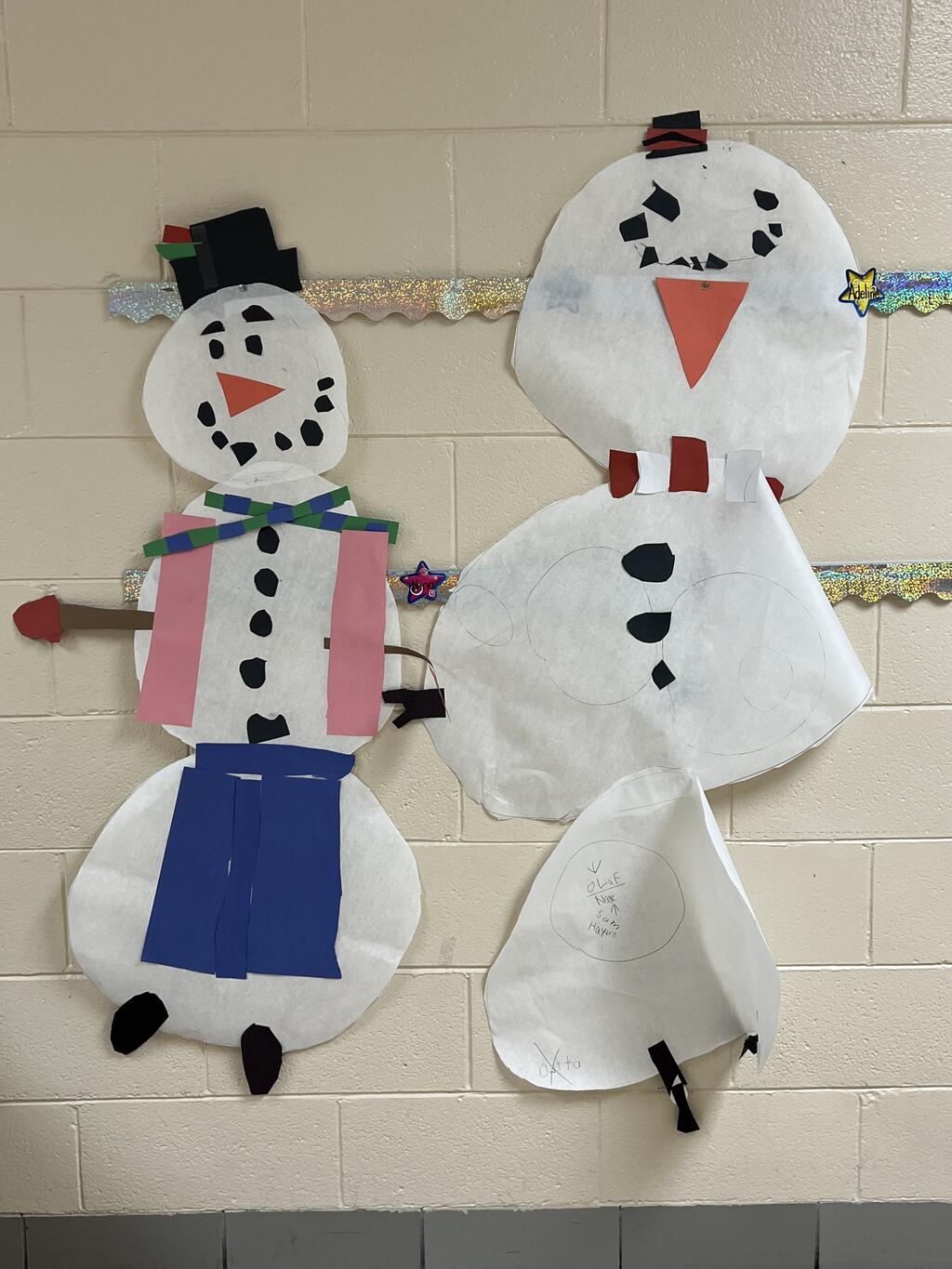During the first week back after a long winter break, first graders participated in a STEM challenge to build the biggest snowman they could from one 6 foot sheet of white bulletin board paper. Teachers only provided a few simple rules for the STEM challenge: student would only get one 6 foot sheet of paper, the snowmen had to have three seperate paper circles and must include buttons, eyes, nose, arms etc. The objective was to build the biggest snowman they could and to be as creative as possible.