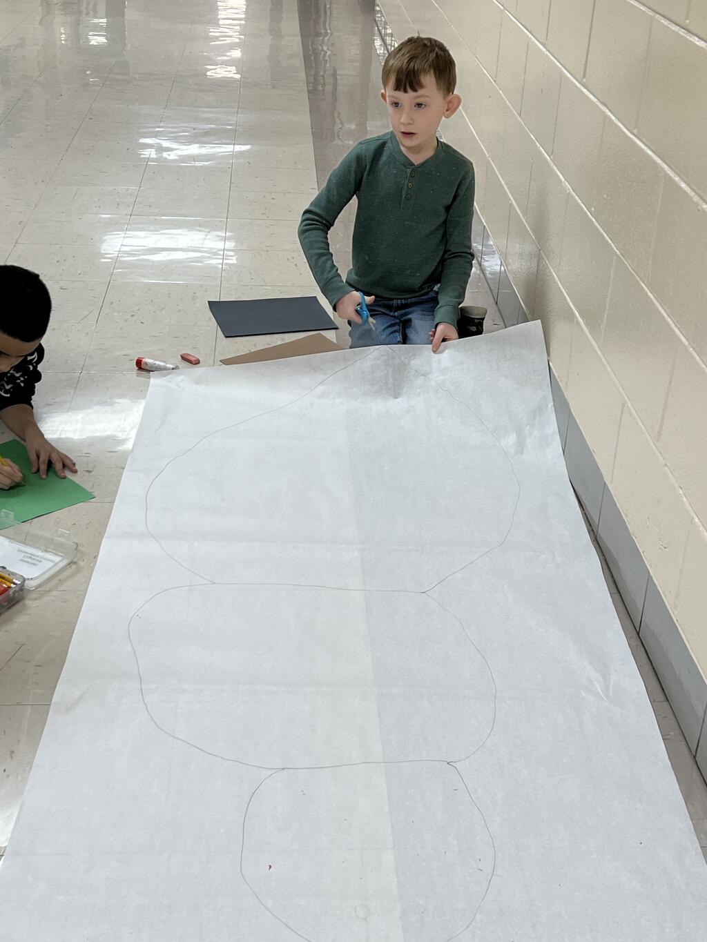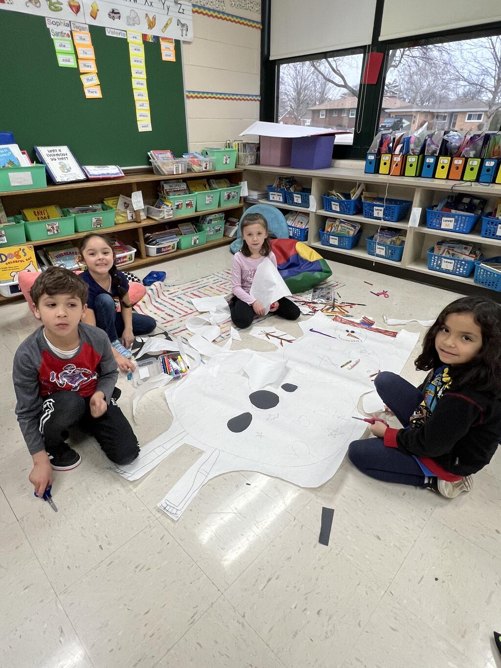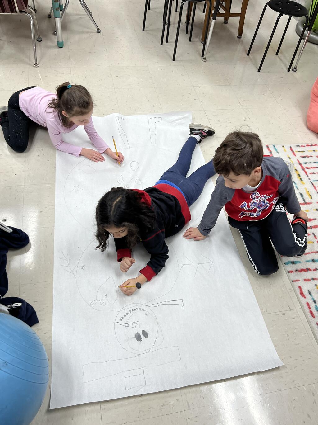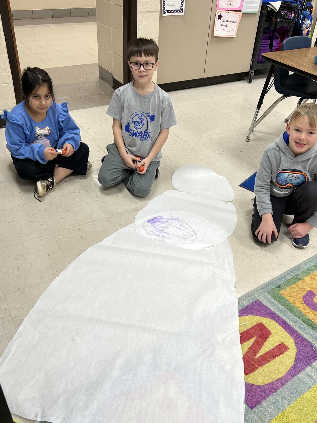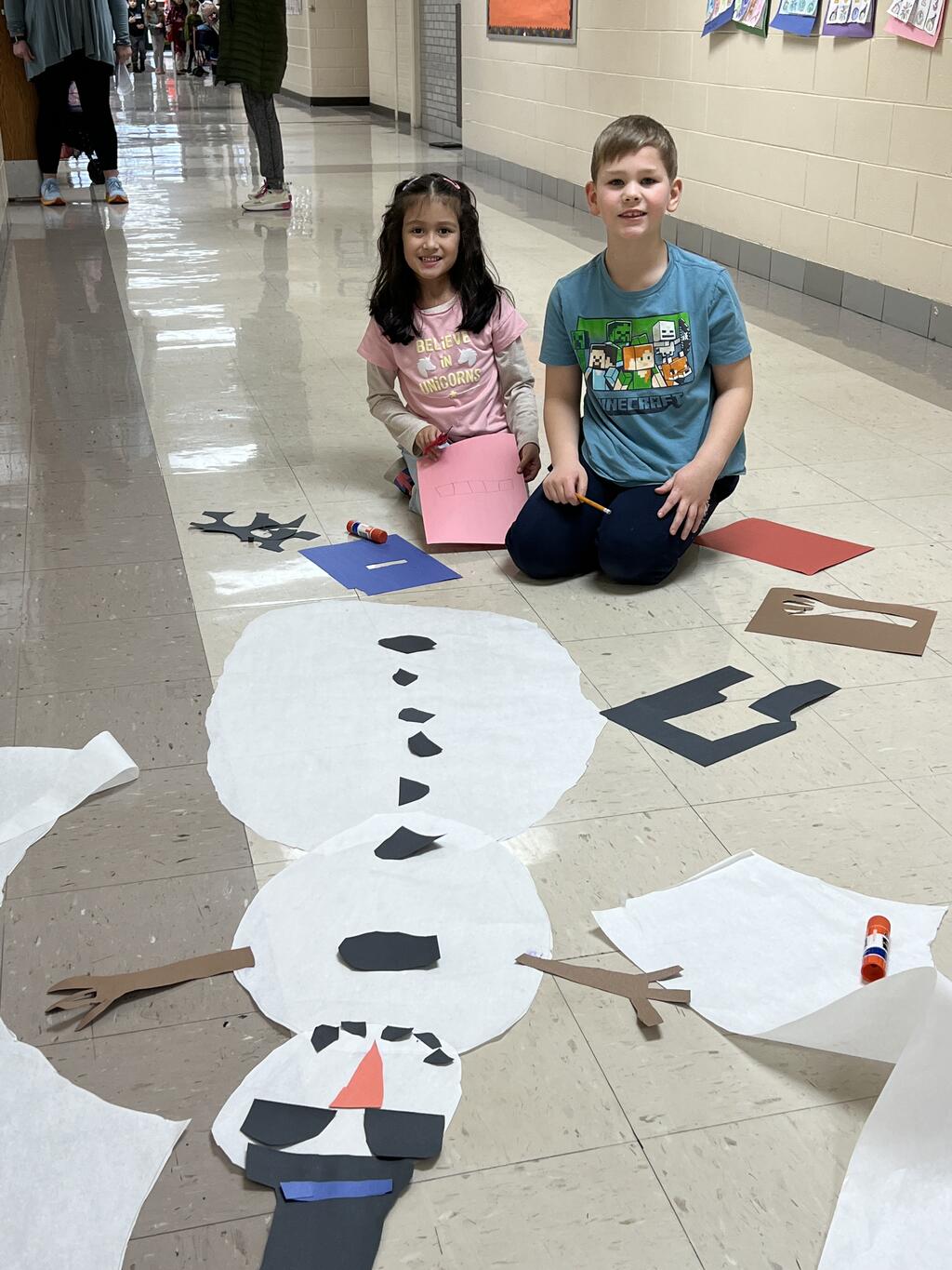 During the first week back after a long winter break, first graders participated in a STEM challenge to build the biggest snowman they could from one 6 foot sheet of white bulletin board paper. Teachers only provided a few simple rules for the STEM challenge: student would only get one 6 foot sheet of paper, the snowmen had to have three seperate paper circles and must include buttons, eyes, nose, arms etc. The objective was to build the biggest snowman they could and to be as creative as possible.