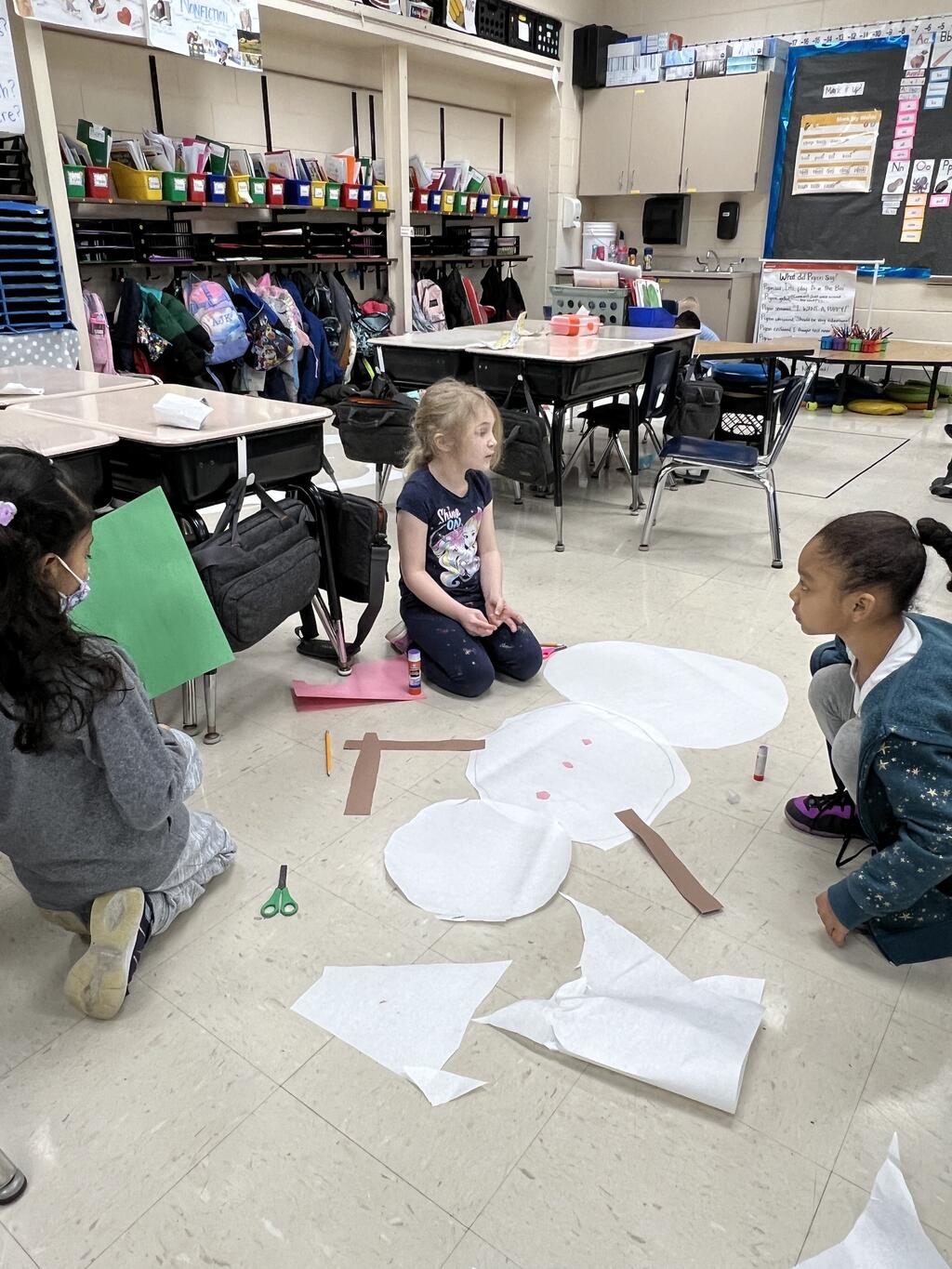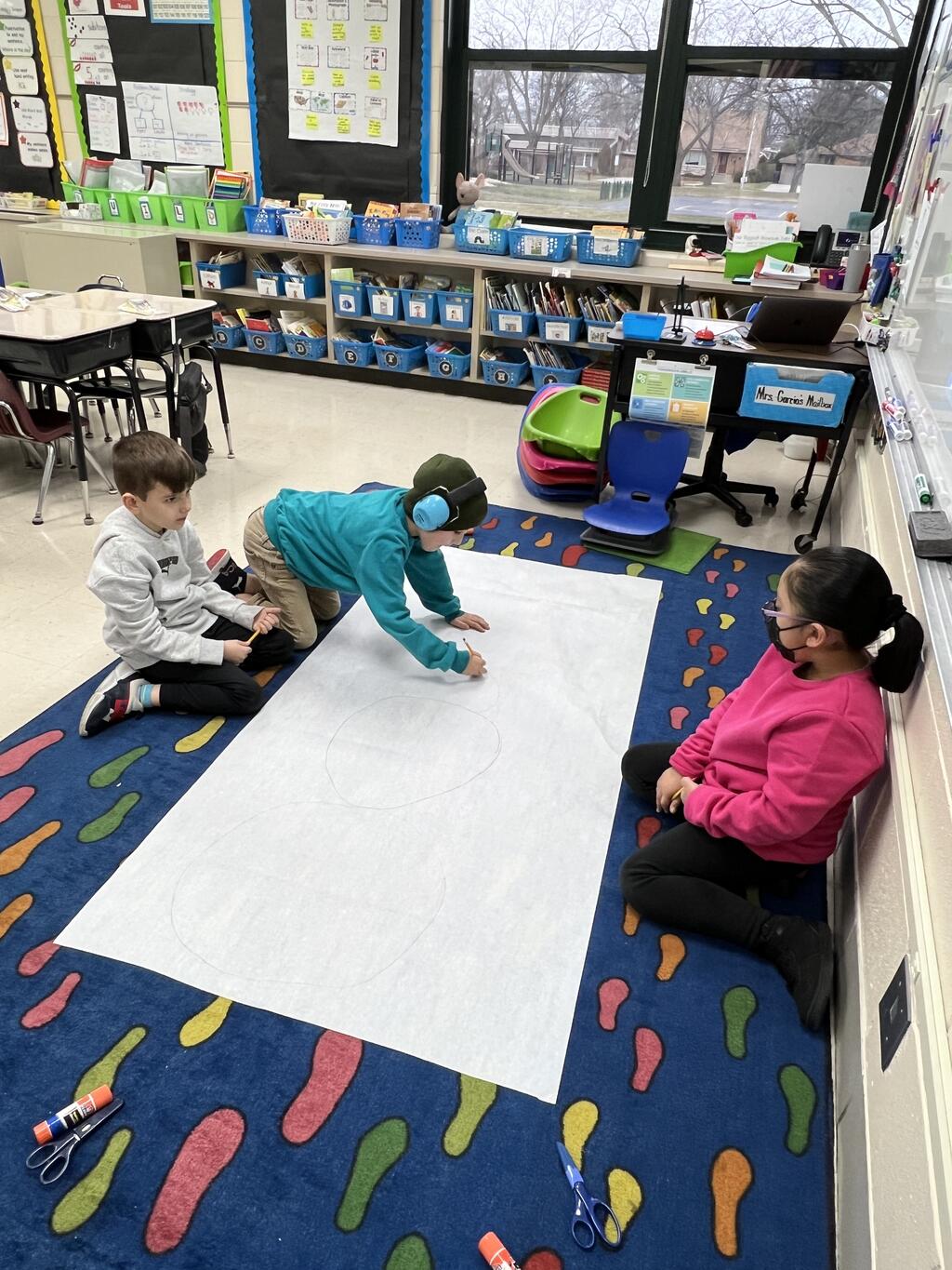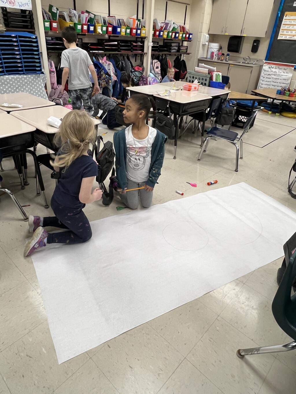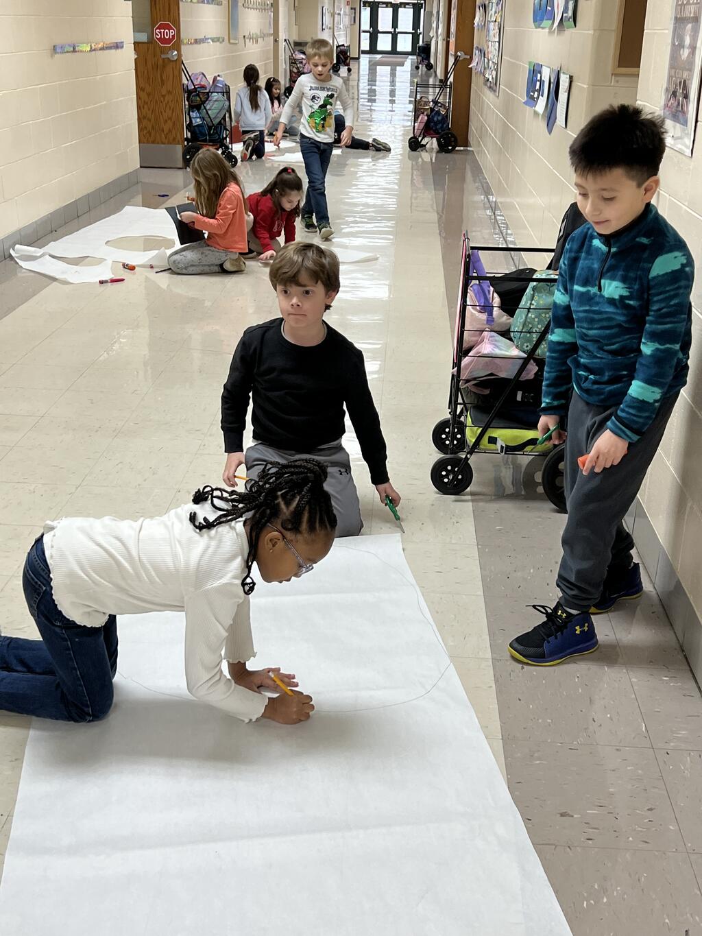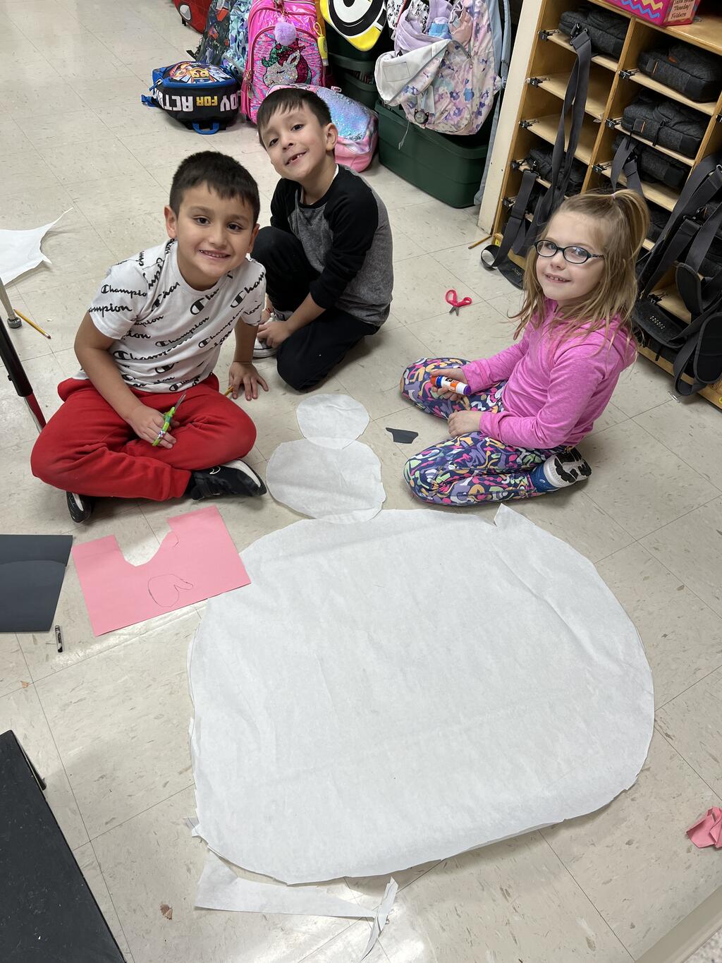 During the first week back after a long winter break, first graders participated in a STEM challenge to build the biggest snowman they could from one 6 foot sheet of white bulletin board paper. Teachers only provided a few simple rules for the STEM challenge: student would only get one 6 foot sheet of paper, the snowmen had to have three seperate paper circles and must include buttons, eyes, nose, arms etc. The objective was to build the biggest snowman they could and to be as creative as possible.