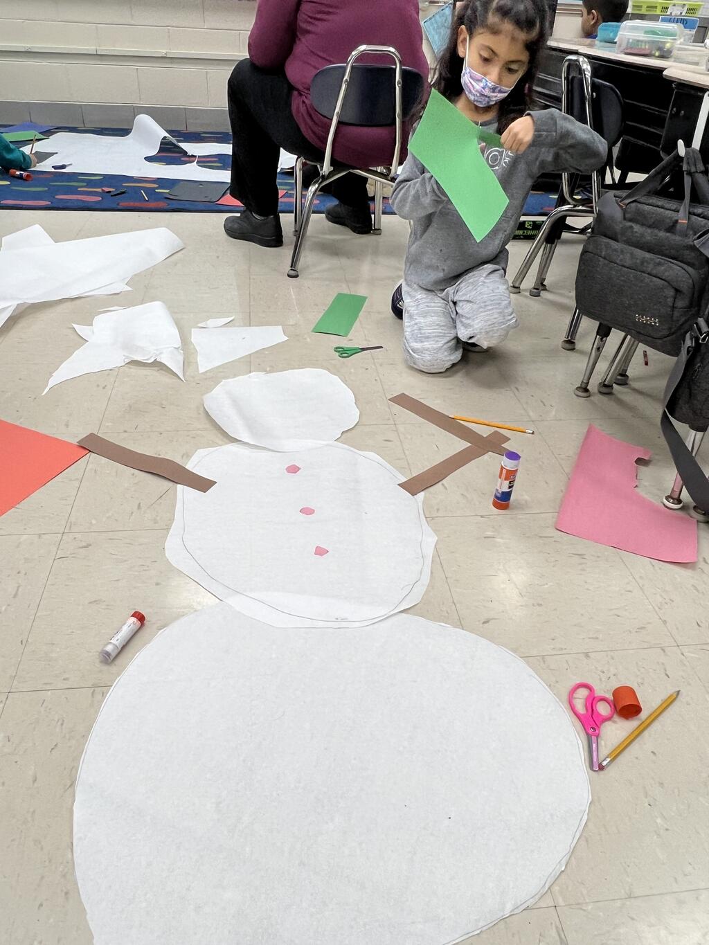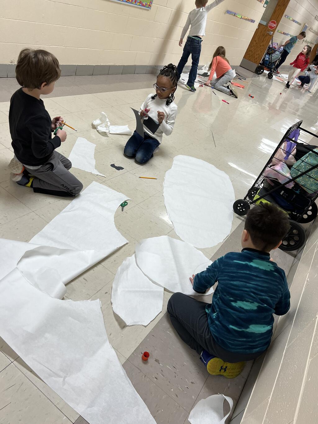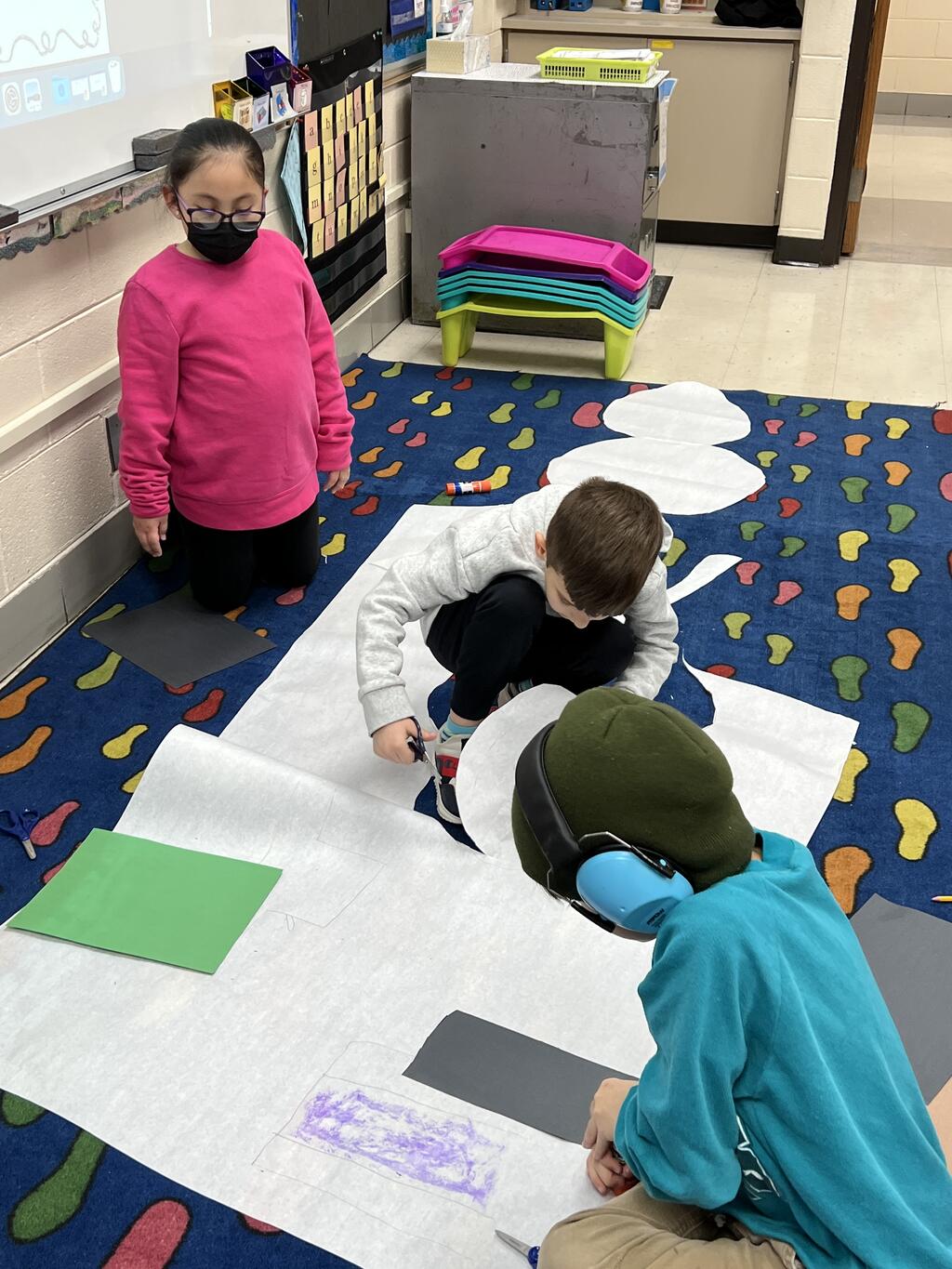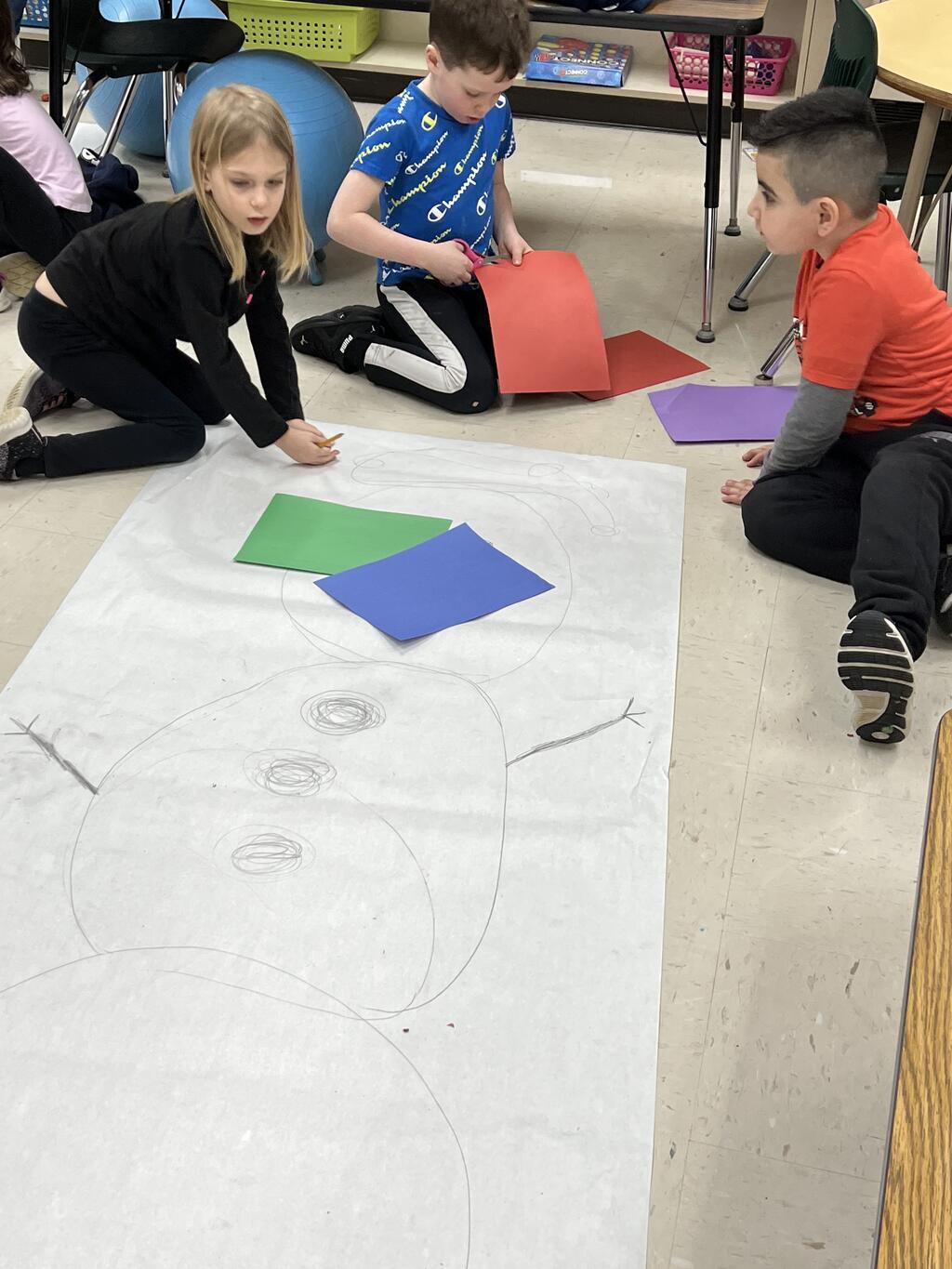 During the first week back after a long winter break, first graders participated in a STEM challenge to build the biggest snowman they could from one 6 foot sheet of white bulletin board paper. Teachers only provided a few simple rules for the STEM challenge: student would only get one 6 foot sheet of paper, the snowmen had to have three seperate paper circles and must include buttons, eyes, nose, arms etc. The objective was to build the biggest snowman they could and to be as creative as possible.