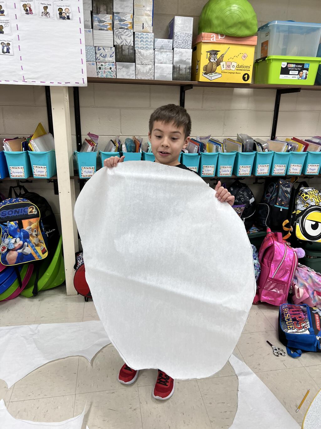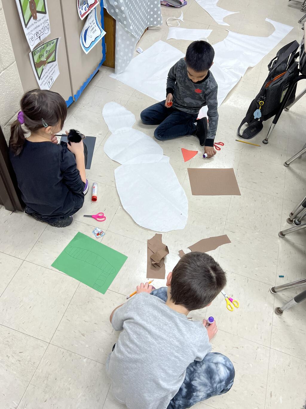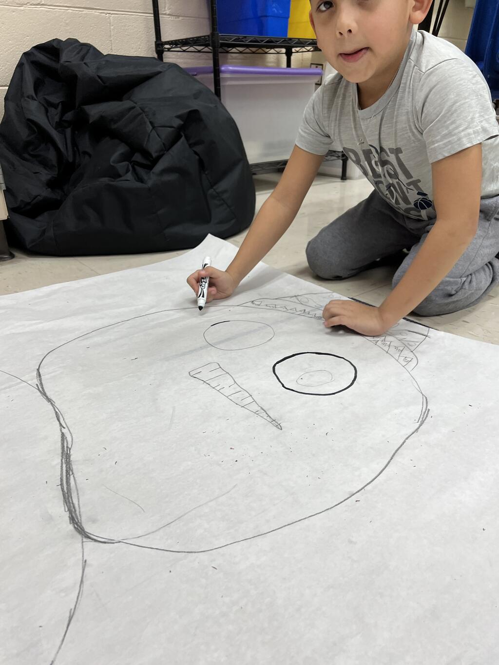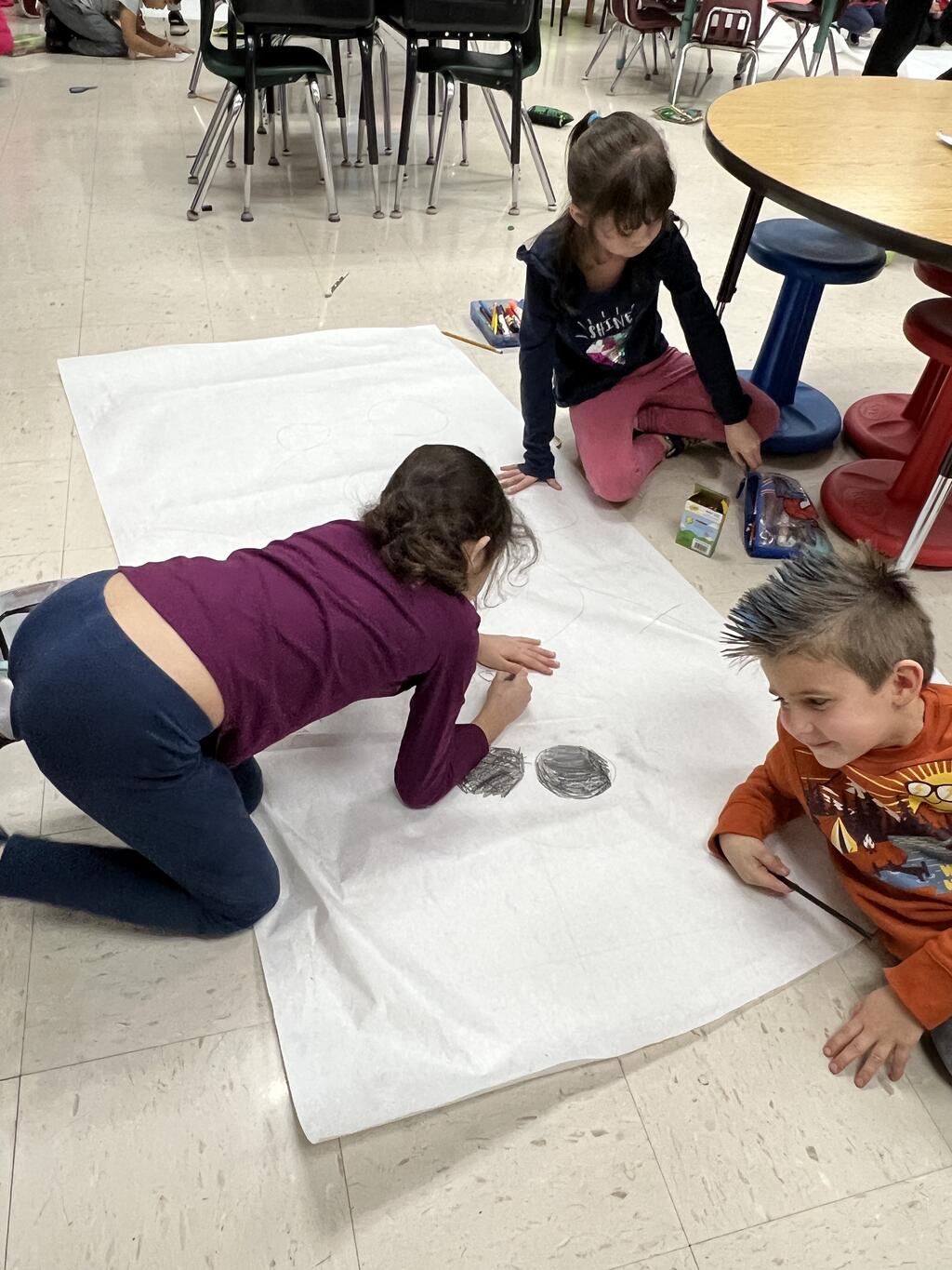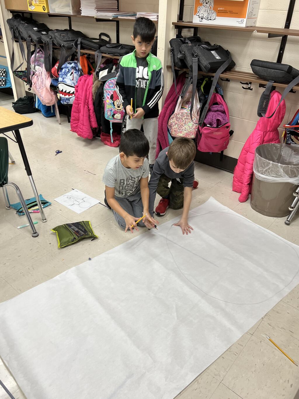 During the first week back after a long winter break, first graders participated in a STEM challenge to build the biggest snowman they could from one 6 foot sheet of white bulletin board paper. Teachers only provided a few simple rules for the STEM challenge: student would only get one 6 foot sheet of paper, the snowmen had to have three seperate paper circles and must include buttons, eyes, nose, arms etc. The objective was to build the biggest snowman they could and to be as creative as possible.