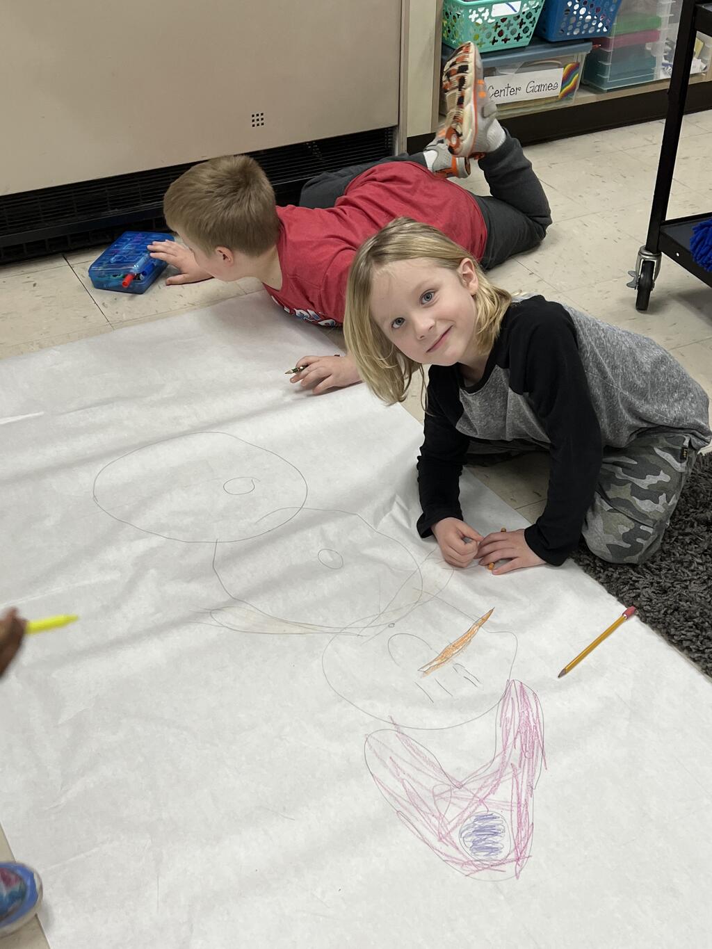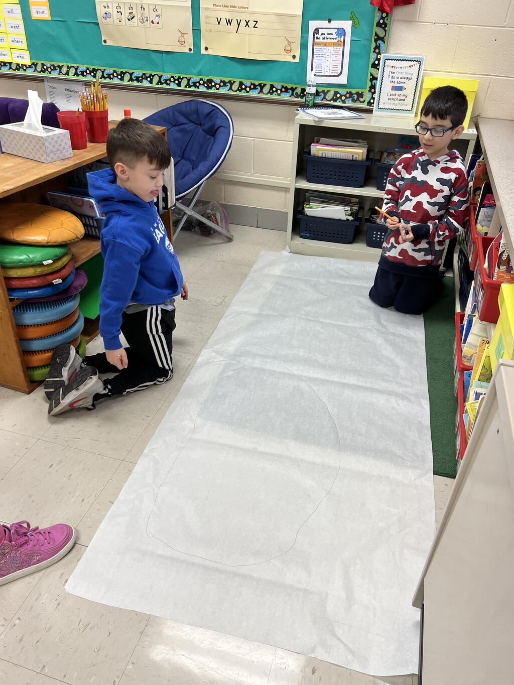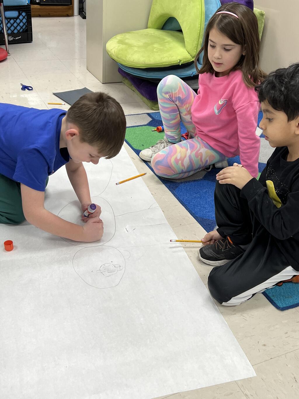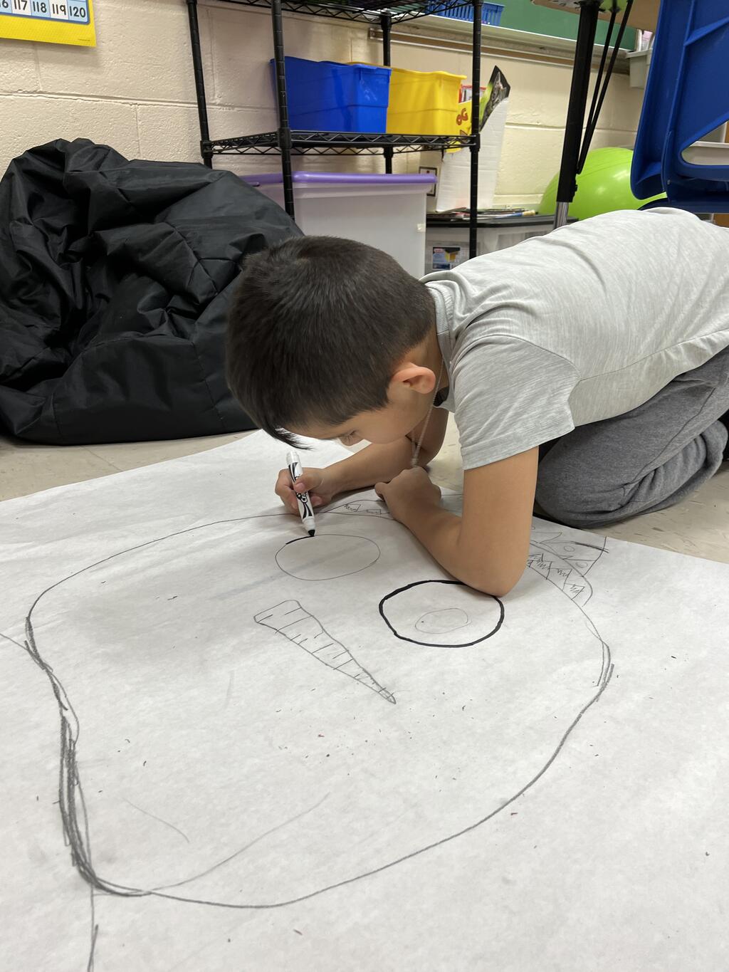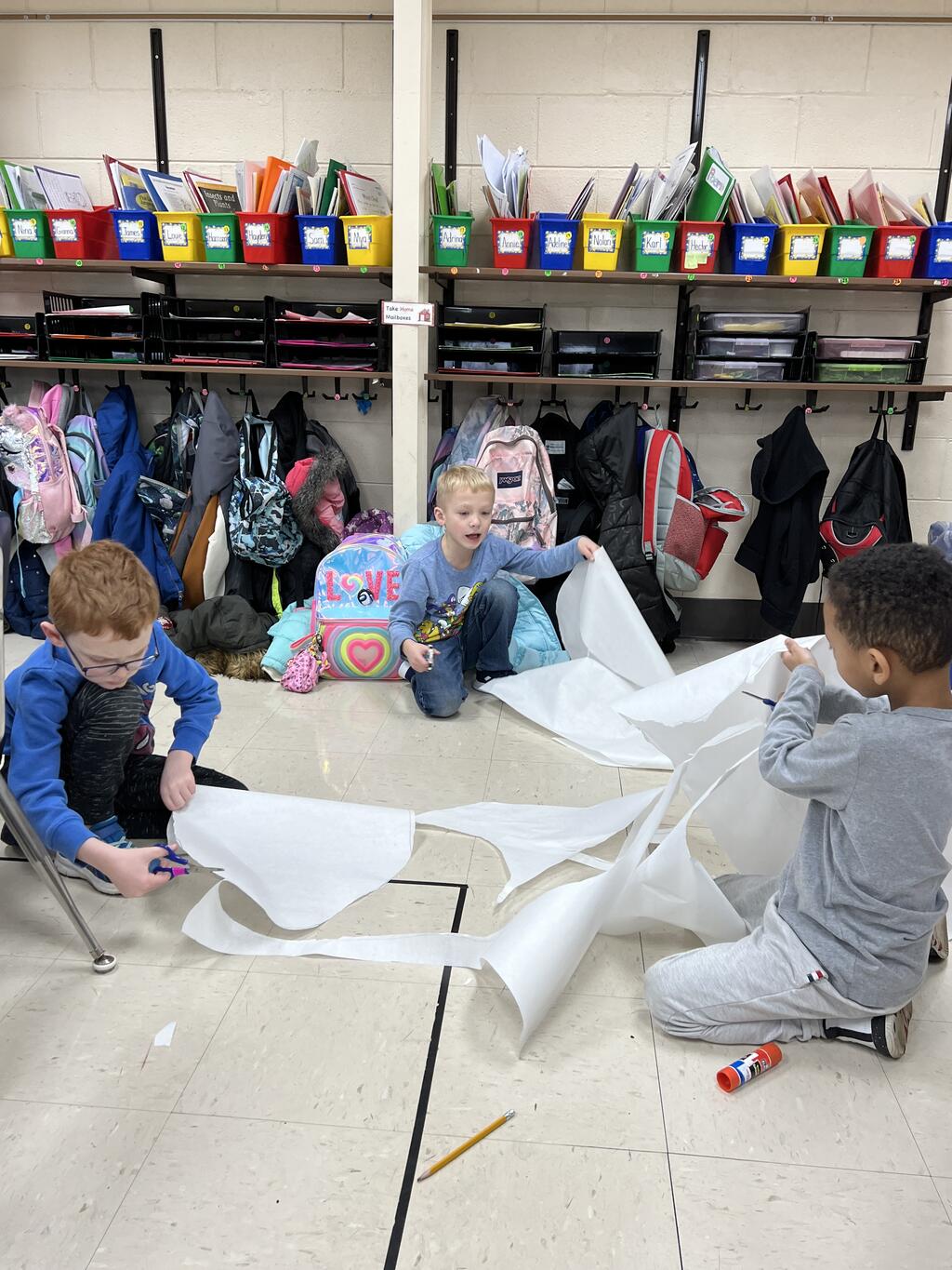 During the first week back after a long winter break, first graders participated in a STEM challenge to build the biggest snowman they could from one 6 foot sheet of white bulletin board paper. Teachers only provided a few simple rules for the STEM challenge: student would only get one 6 foot sheet of paper, the snowmen had to have three seperate paper circles and must include buttons, eyes, nose, arms etc. The objective was to build the biggest snowman they could and to be as creative as possible.