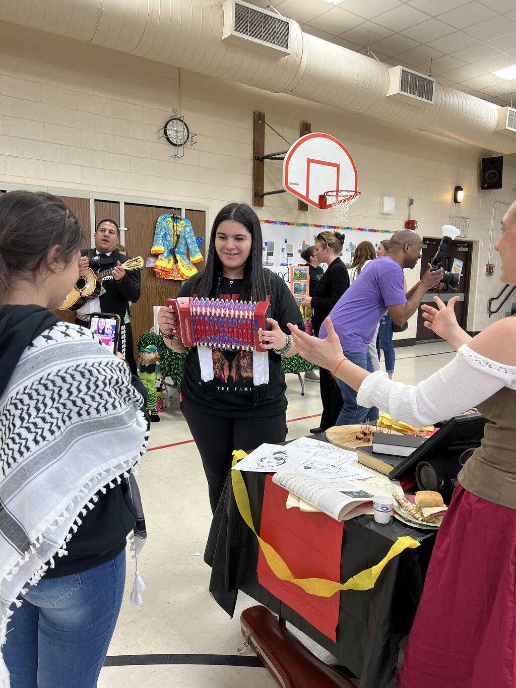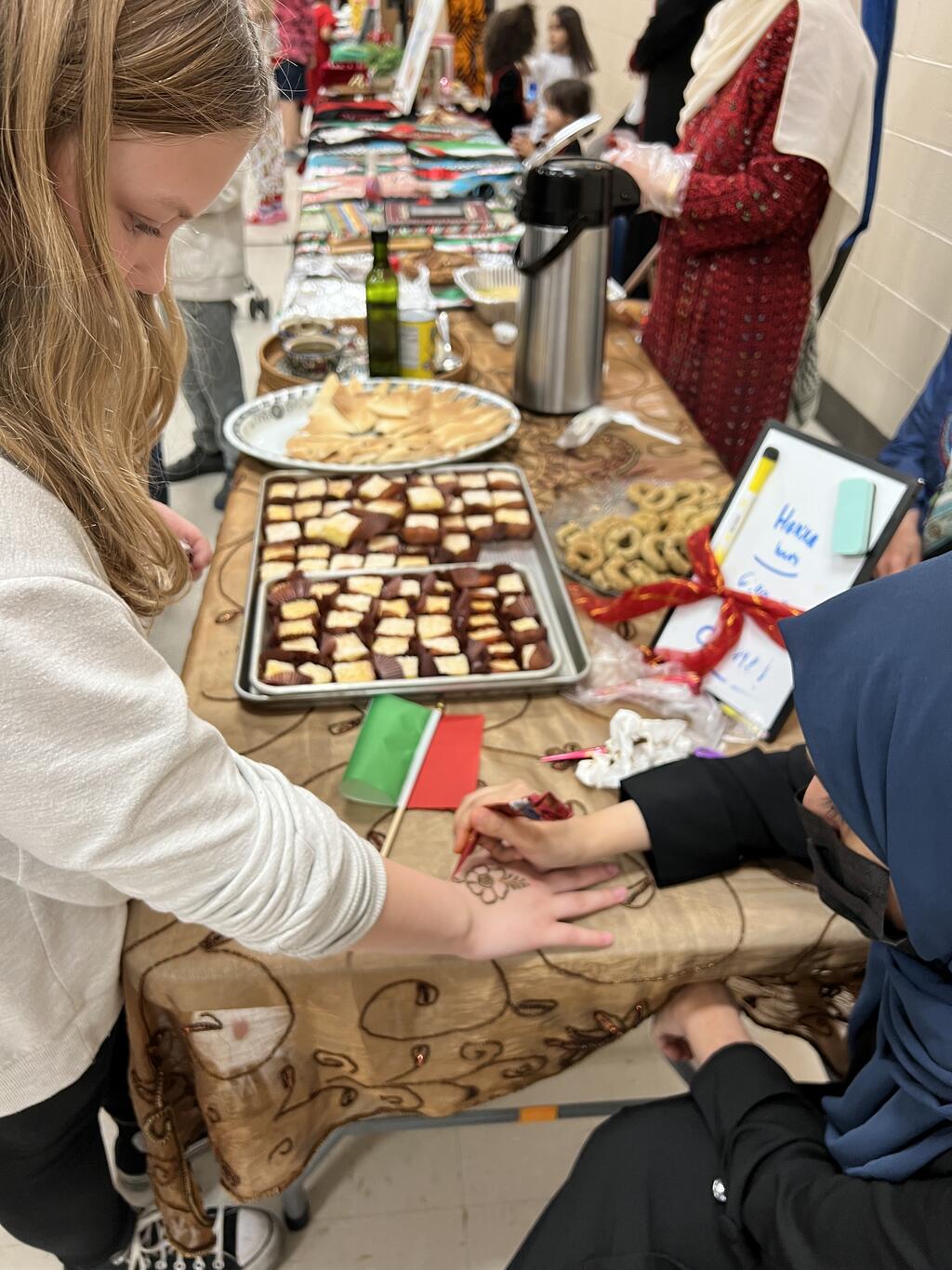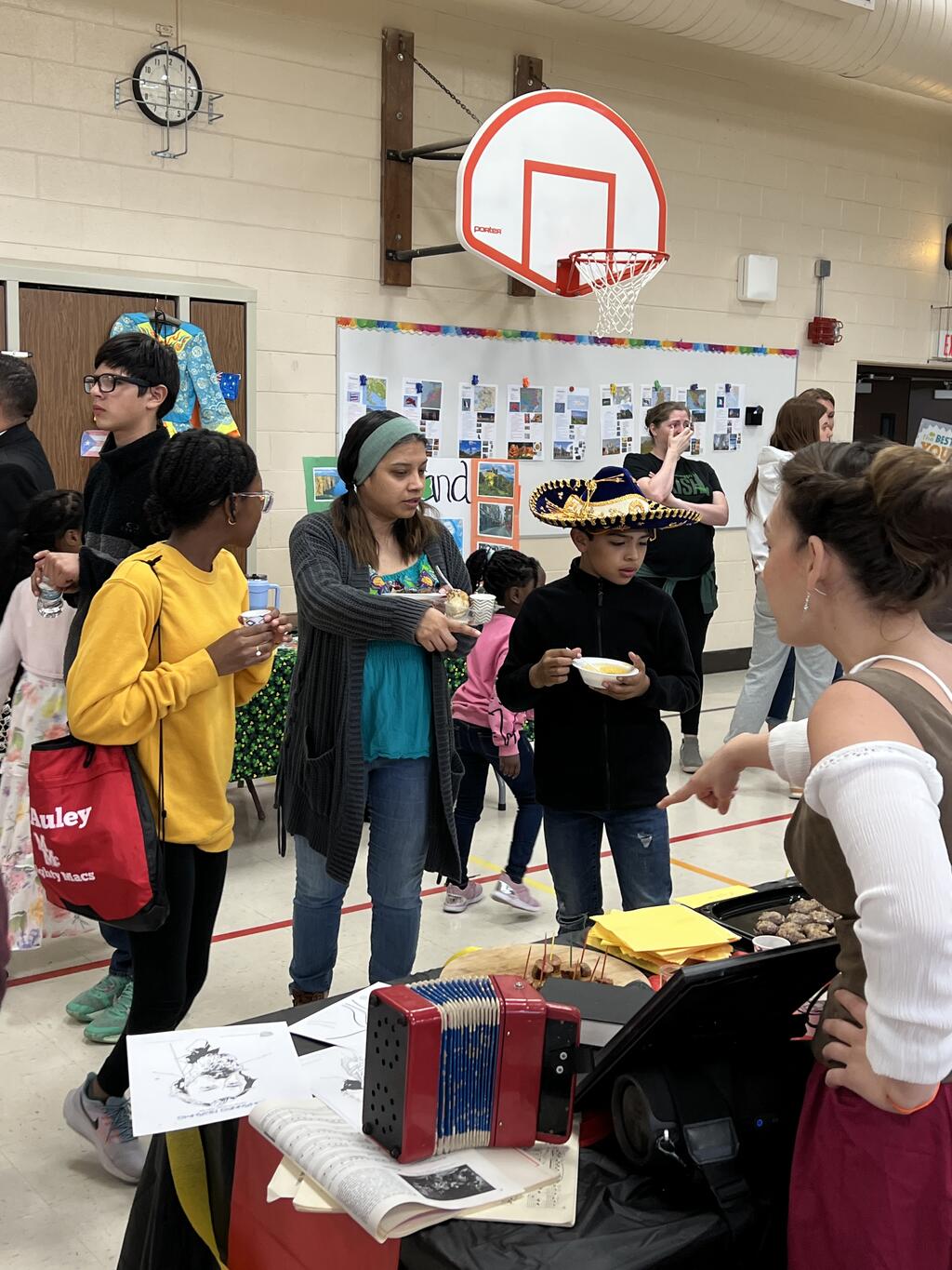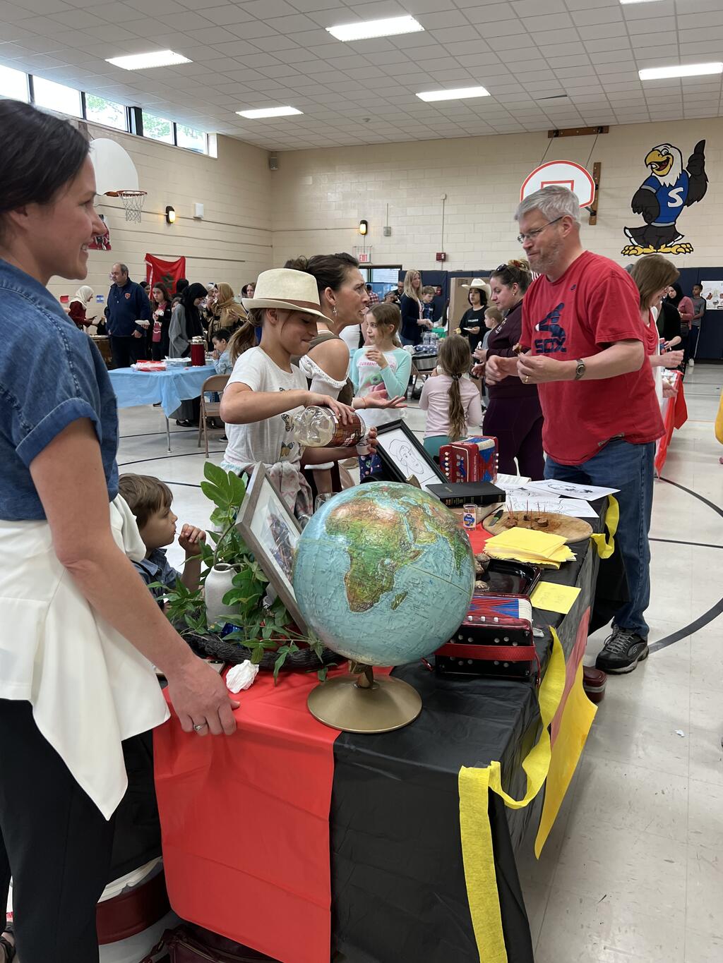 Fourteen different countries were represented by Sward families at the PTA event. Familes volunteered to share their culture with the Sward community. They brought homemade food, shared what special clothing/jewlery is worn in their country, artwork along with historical artifacts. Families also showcased cultural dances and Mr. Hartin performed while students danced along. Students and families got to taste food from around the world and could get a henna tattoo, there was even a marachi band, and a bagpiper! There were special performances from two Dabka dance groups from Andrew and Stagg high schools as well as Mrs. Glikis and her Greek dance group. This was truly a unique event and all who attended had an awesome time. Special thanks to the Sward PTA for organizing this amazing event for the kids and their families.